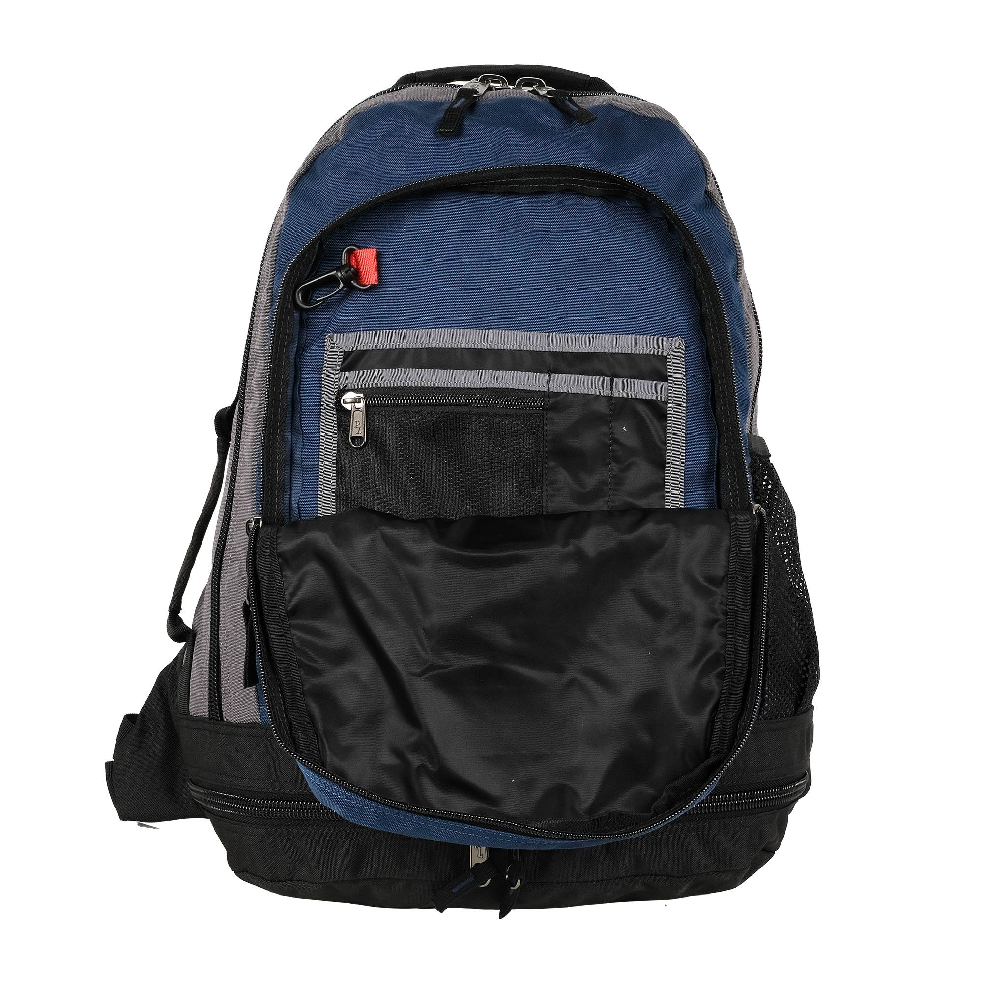 Основное отделение закрывается на молнию и обшито подкладкой. Внутри - органайзер для паспорта и канцелярии. На передней стороне есть большой карман на молнии, внутри которого так же есть органайзер и карабин для ключей. Особенностью данной модели является наличие нижнего отделения на молнии в которое можно положить небольшой зонтик или что-то еще..Снаружи рюкзака есть несколько карманов из трикотажной сетки, декоративная шнуровка и две ручки для переноски. Лямки - мягкие, с поролоновыми вставками. В рюкзаке предусмотрена фиксация лямок на груди и поясной ремень, что позволяет его использовать во время занятий активными видами спорта: лыжи, велосипед, бег и т.п