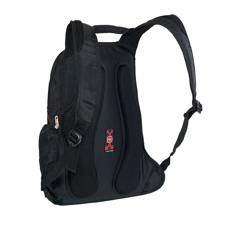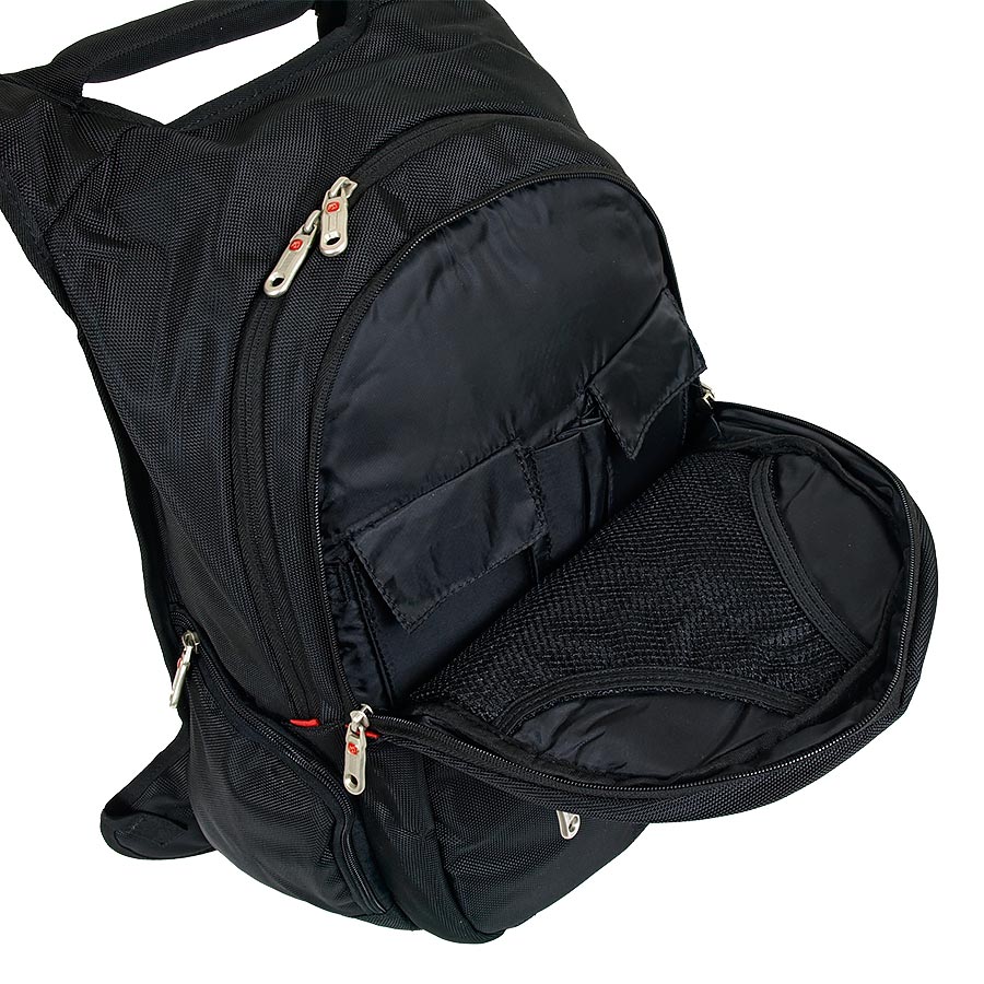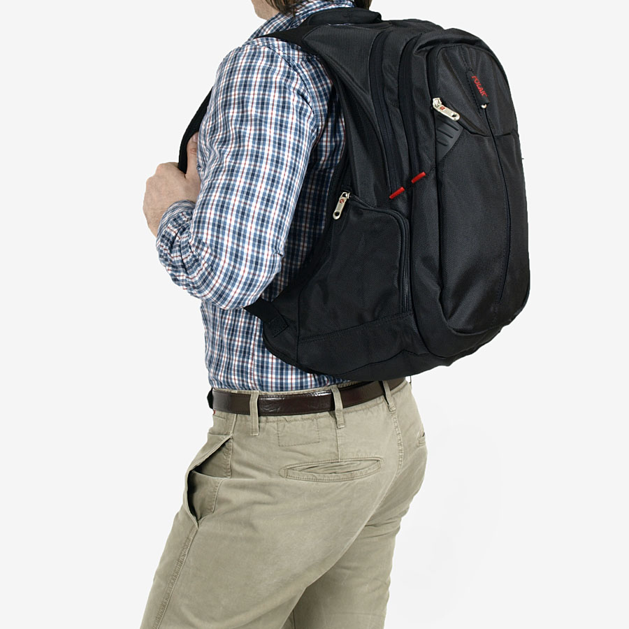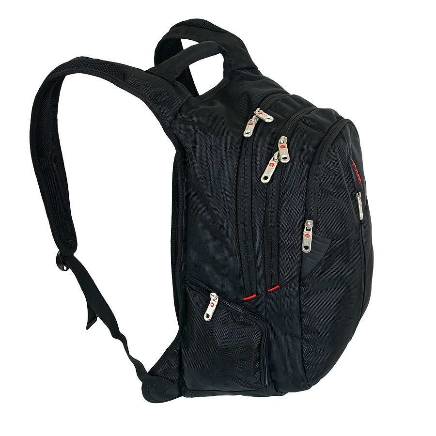 В рюкзаке два отделения, большое и маленькое. Большое - содержит папку-чехол для ноутбука до 15 дюймов, маленькое - органайзер. Снаружи - три кармана на молнии. Спинка и лямки выполнены из мягкого, продуваемого материала. Рюкзаки имеет конструкцию "майка" для предотвращения сползания лямок с плечей. Эта модель рассчитана на рост 170-195см.