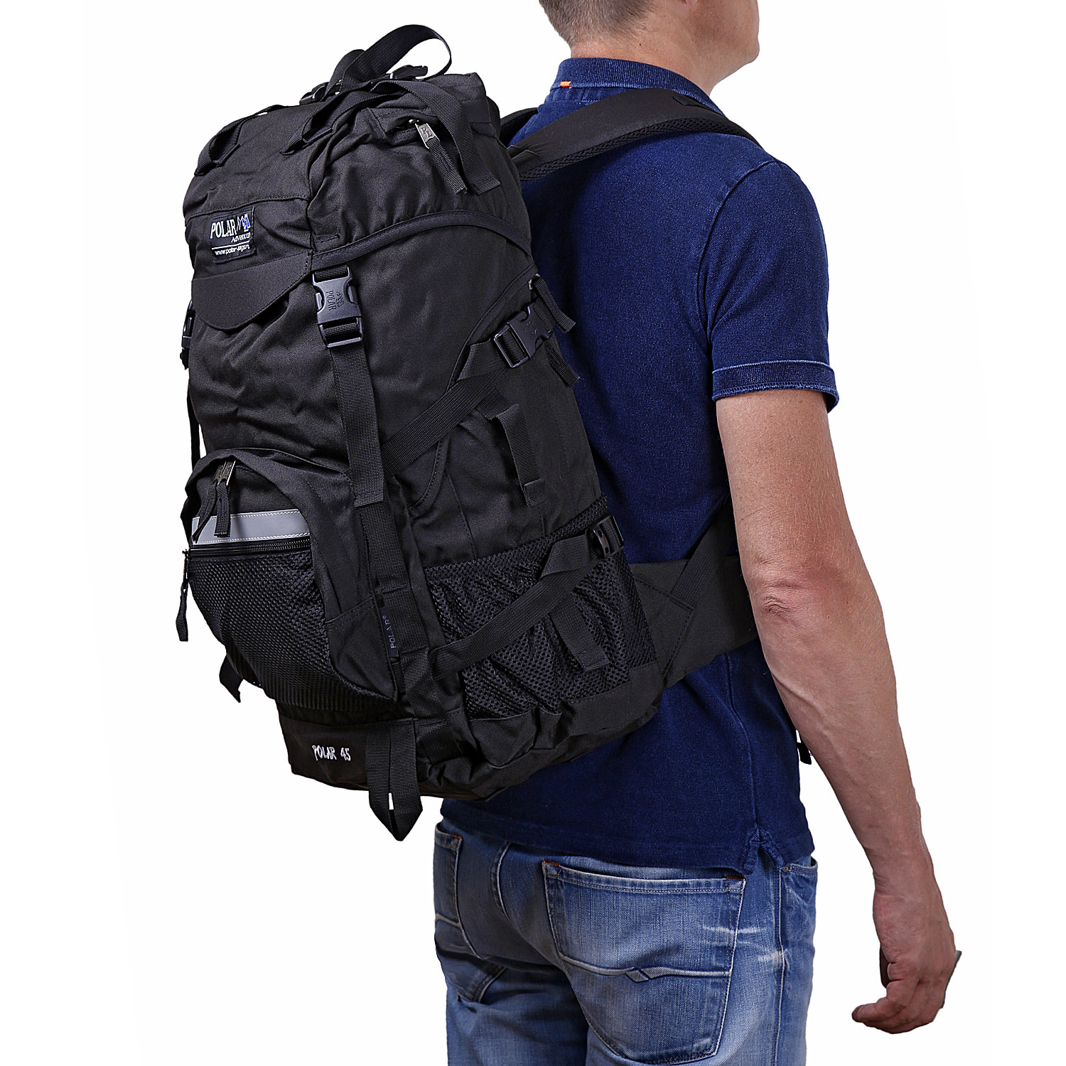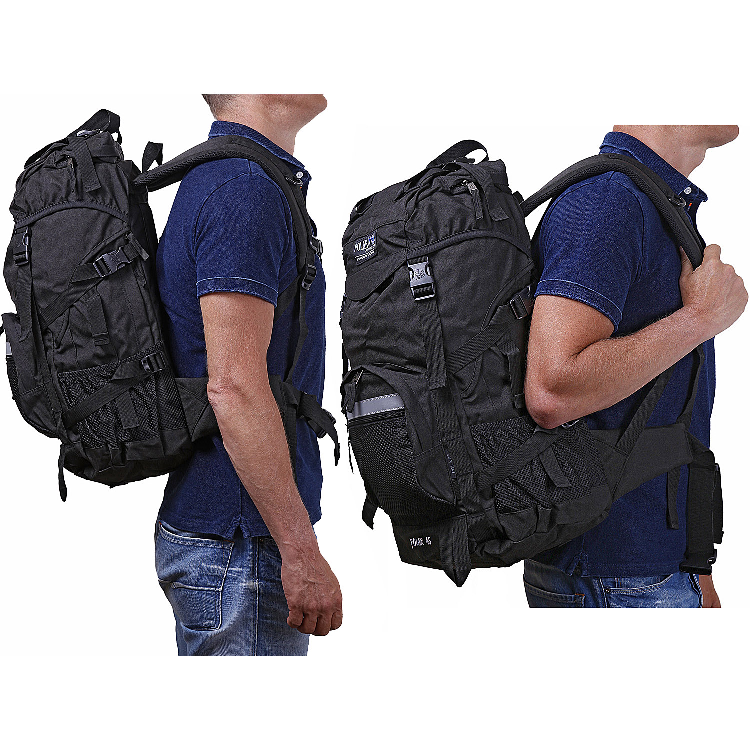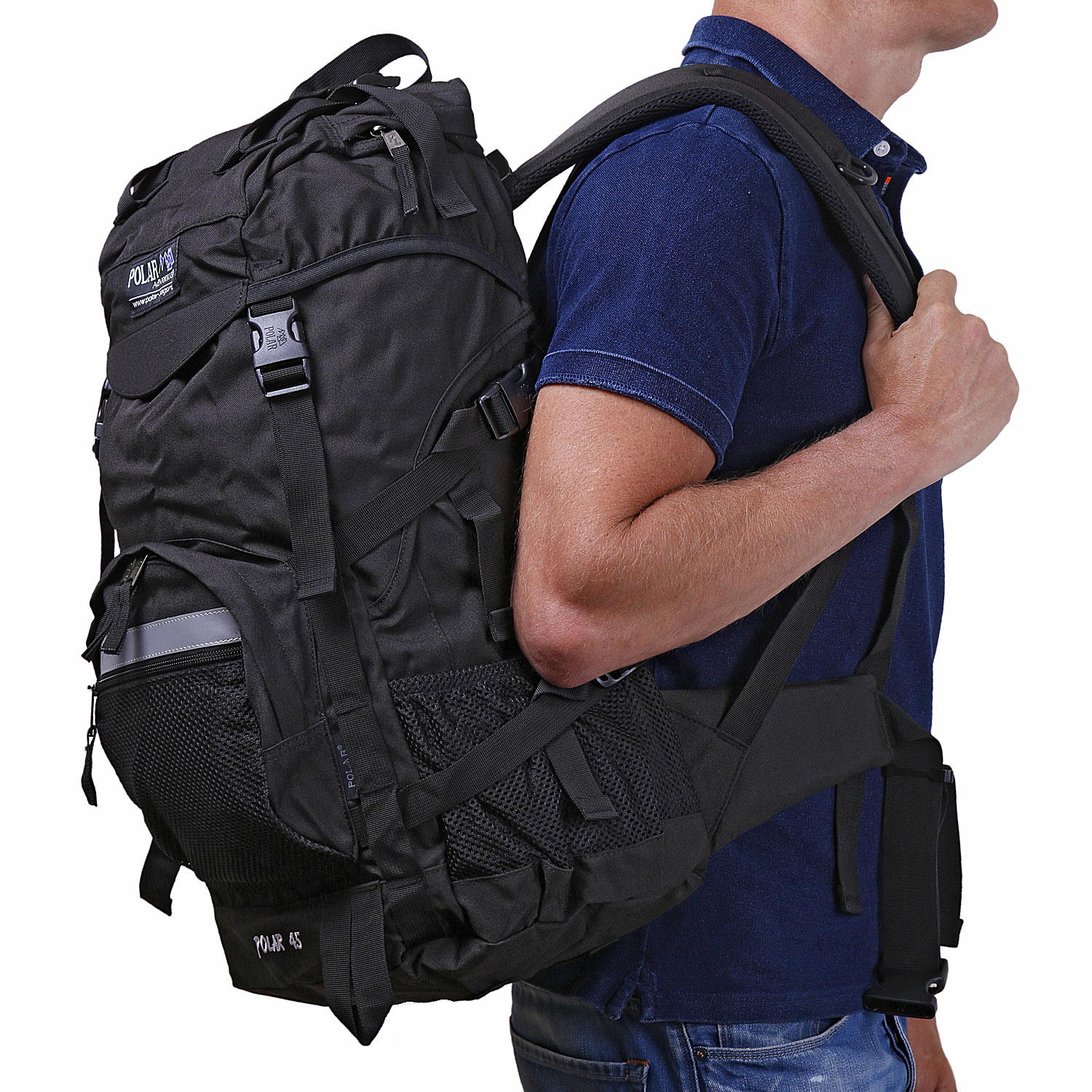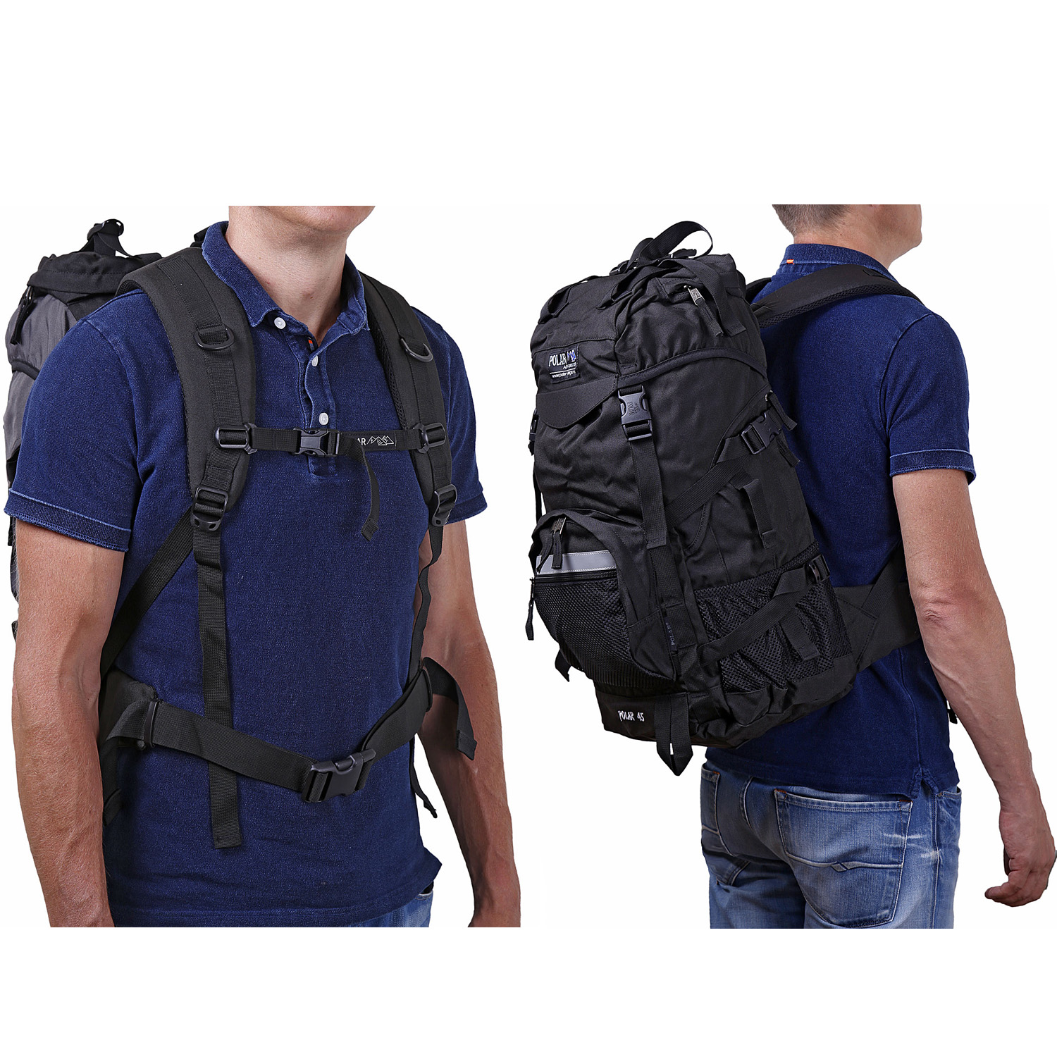 Рюкзак туристический объемом 45л. Основное отделение затягивается шнуром и сверху закрывается на клапан. Снаружи — четыре кармана на молнии и два открытых кармана из трикотажной сетки.