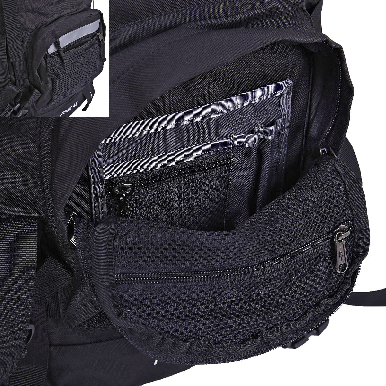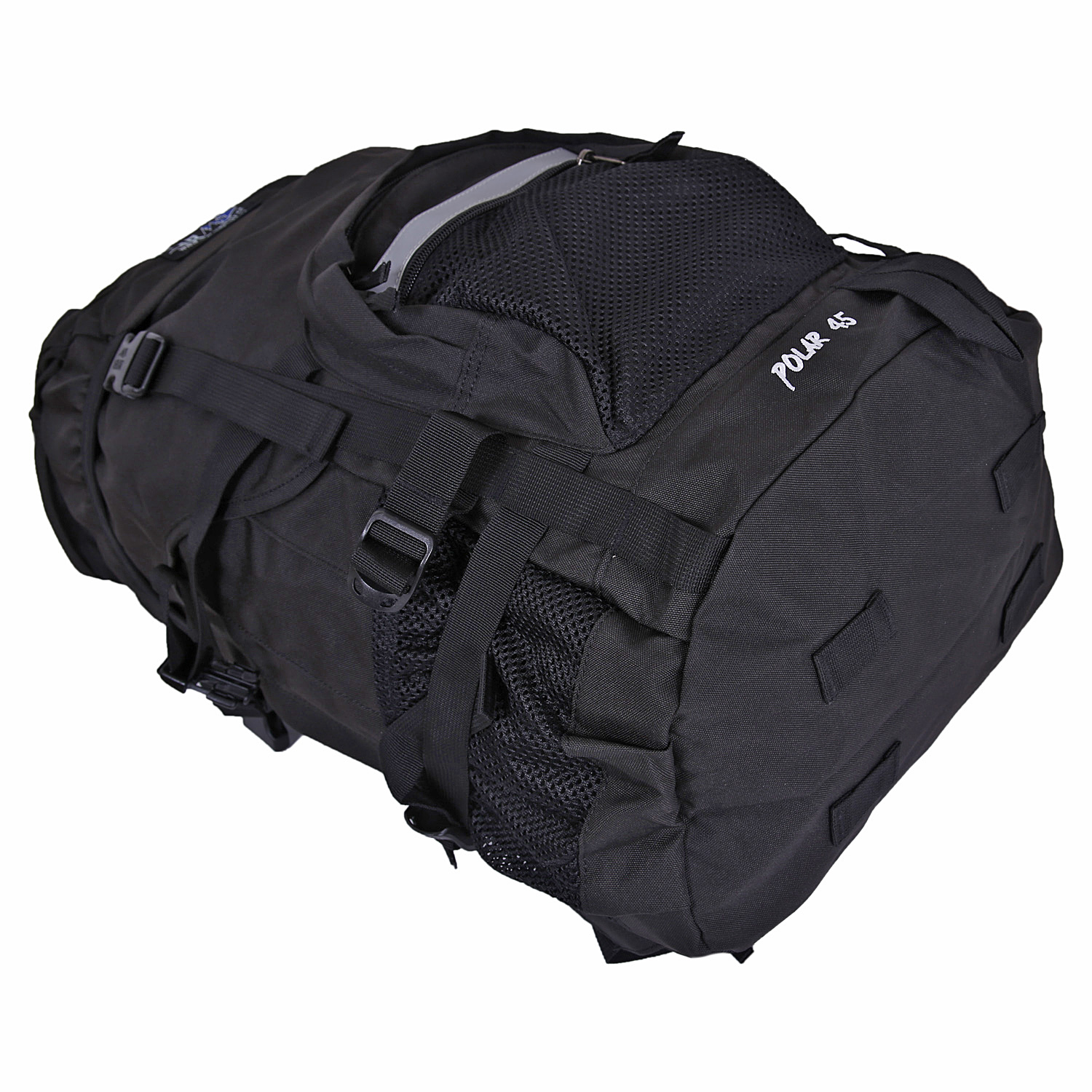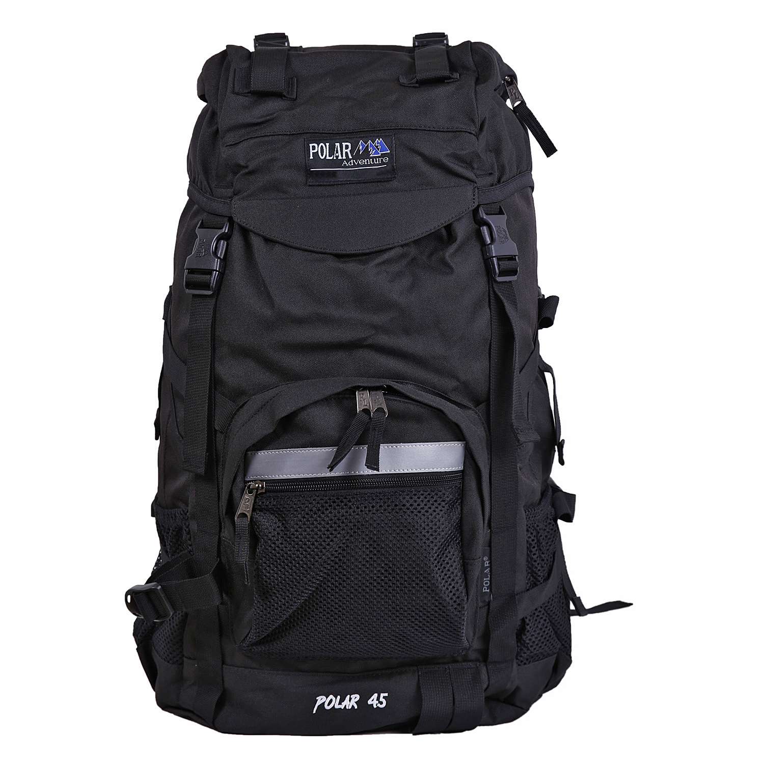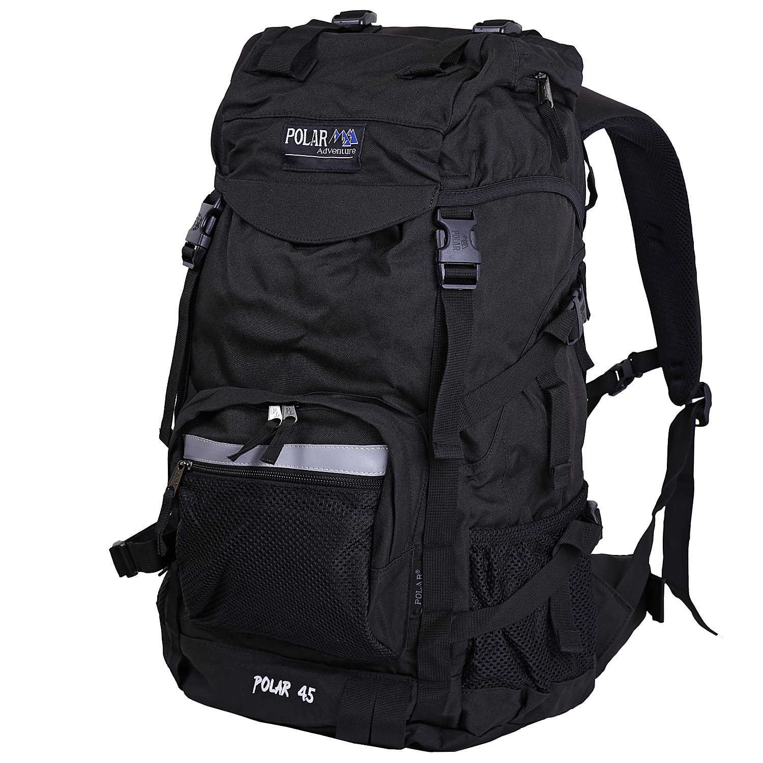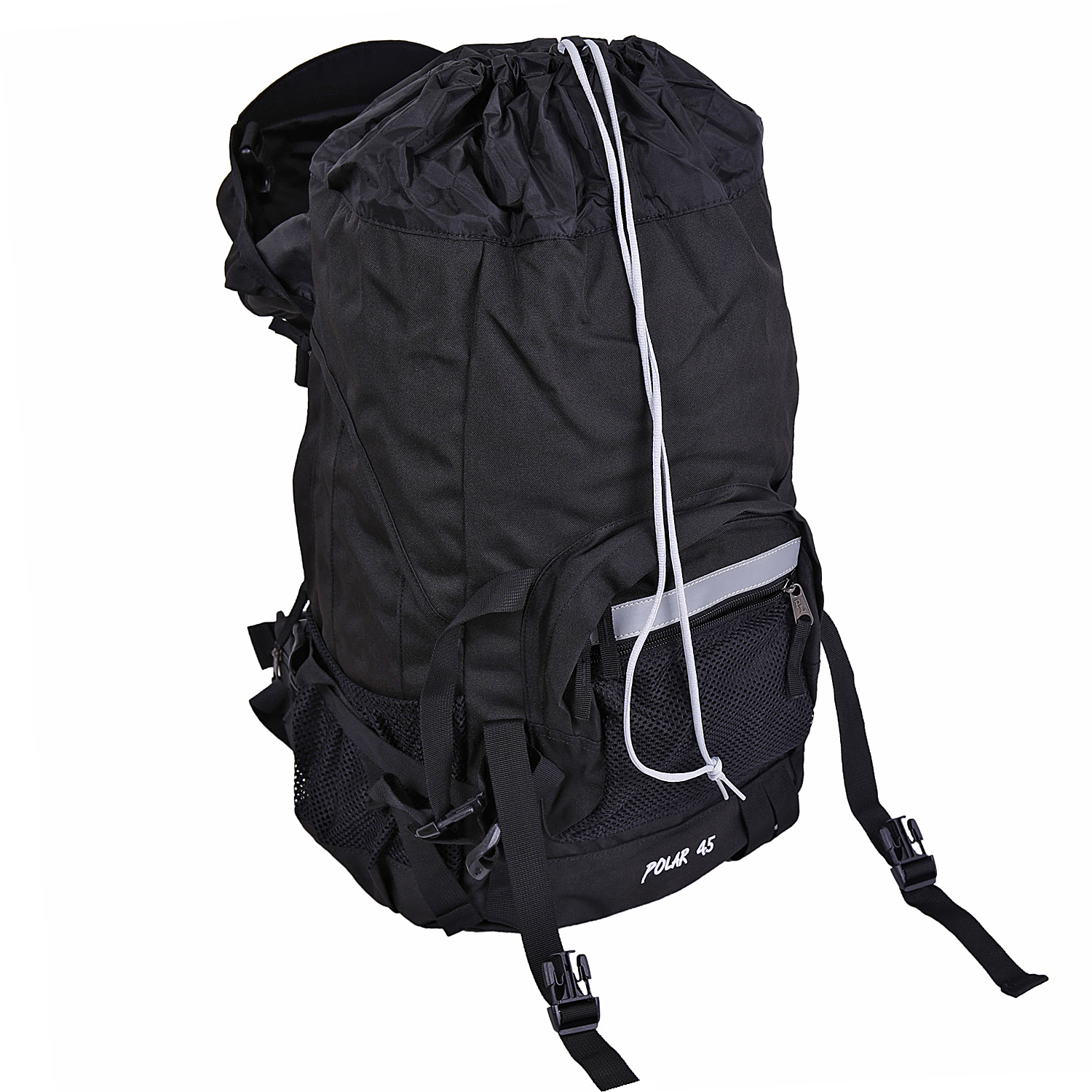 Рюкзак туристический объемом 45л. Основное отделение затягивается шнуром и сверху закрывается на клапан. Снаружи — четыре кармана на молнии и два открытых кармана из трикотажной сетки.