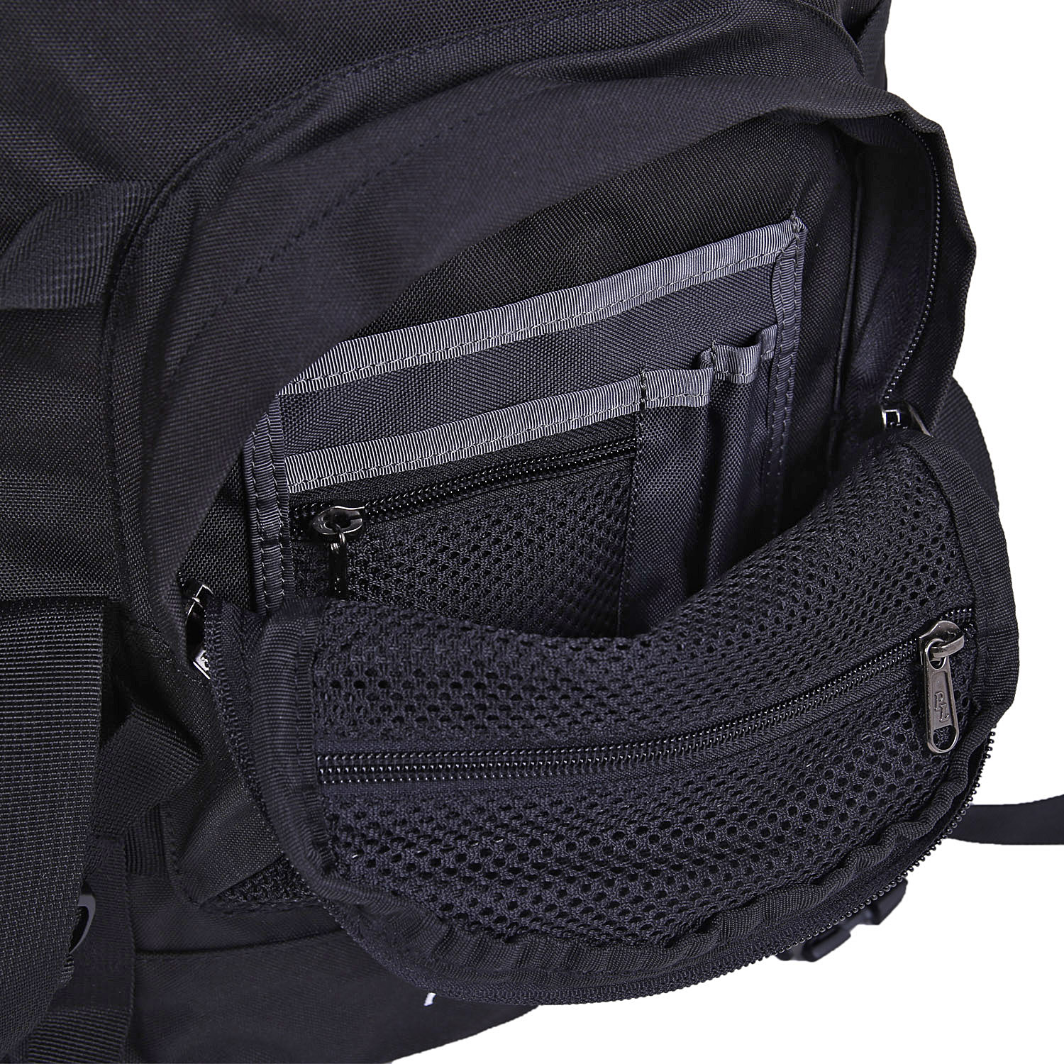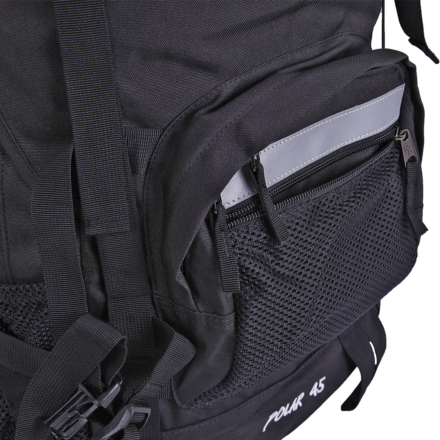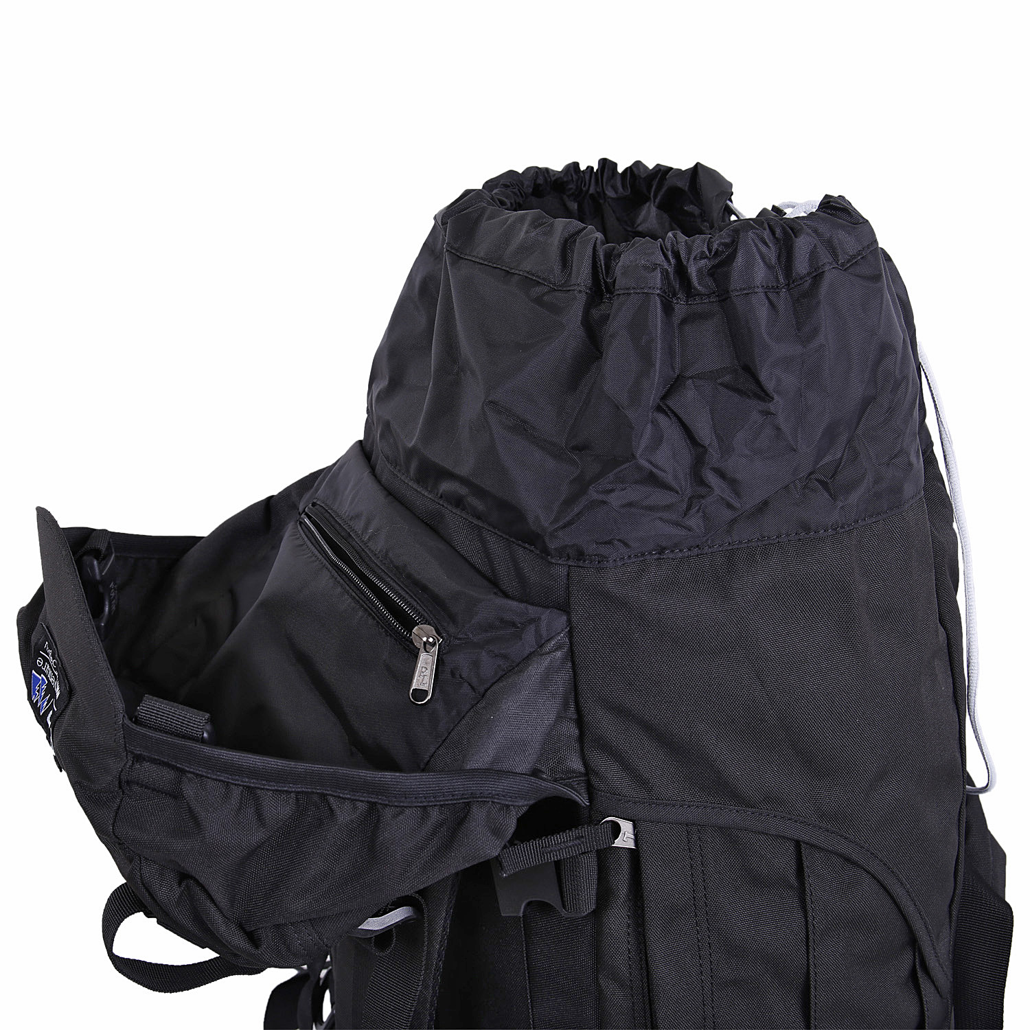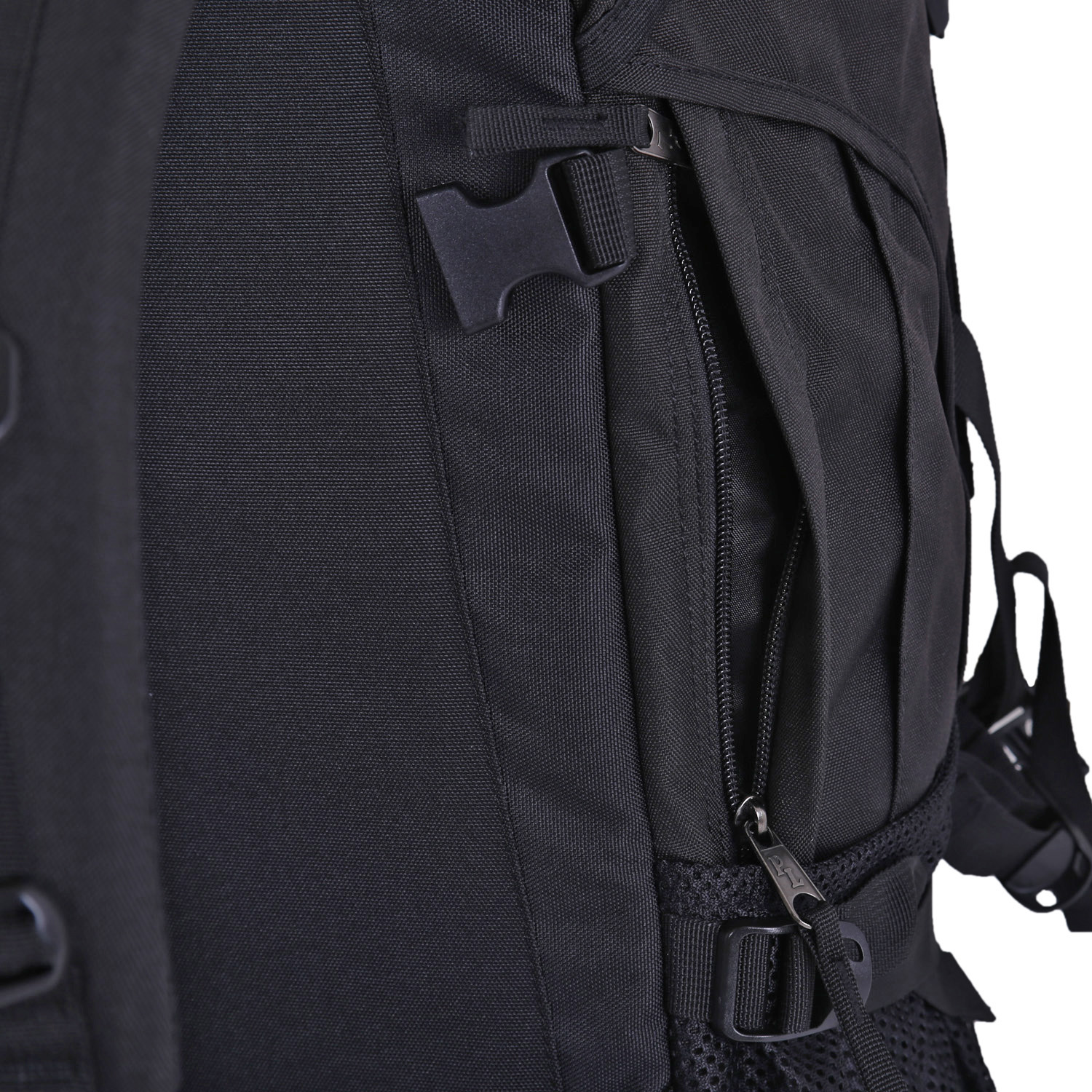 Рюкзак туристический объемом 45л. Основное отделение затягивается шнуром и сверху закрывается на клапан. Снаружи — четыре кармана на молнии и два открытых кармана из трикотажной сетки.