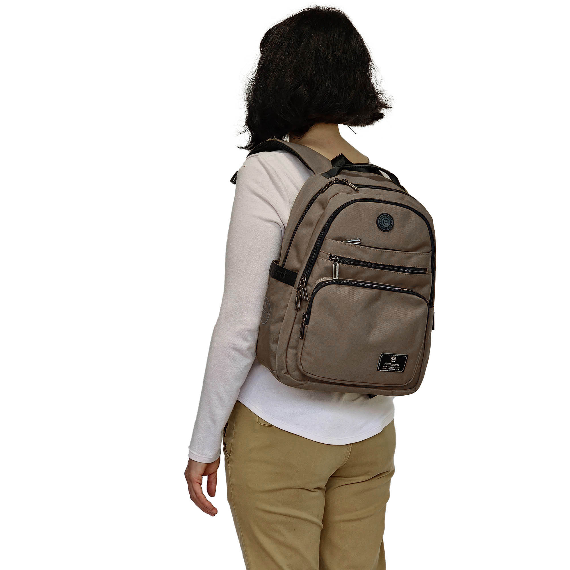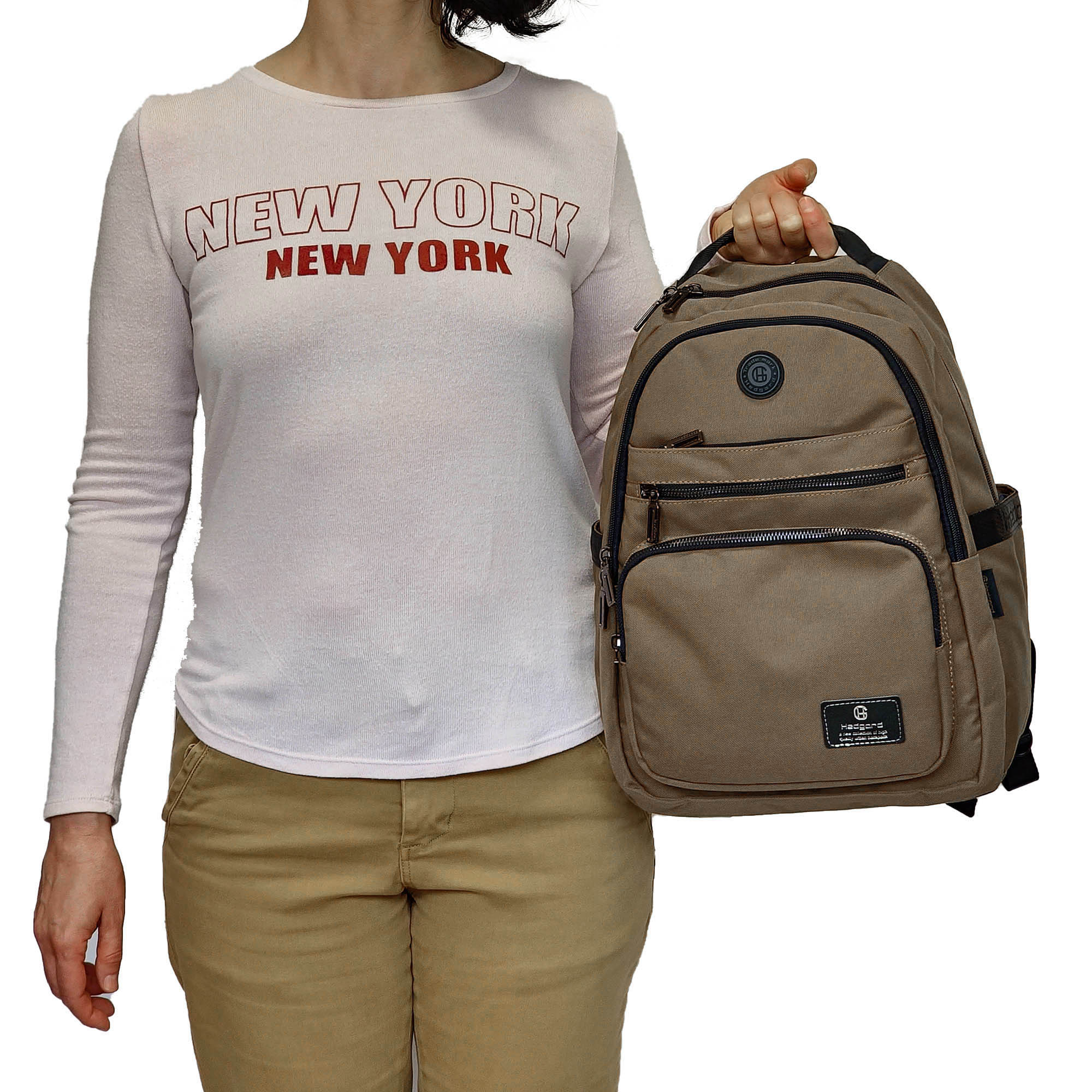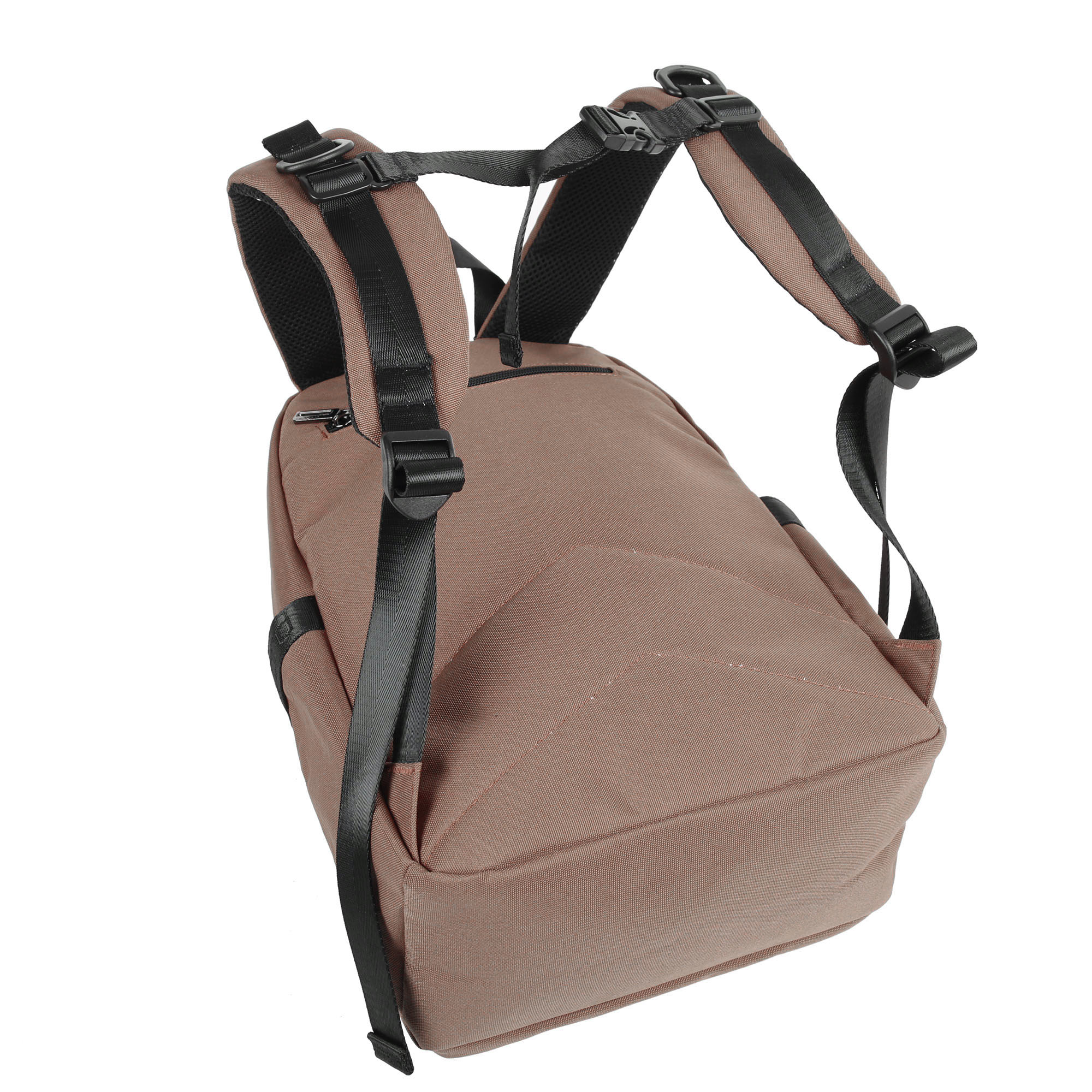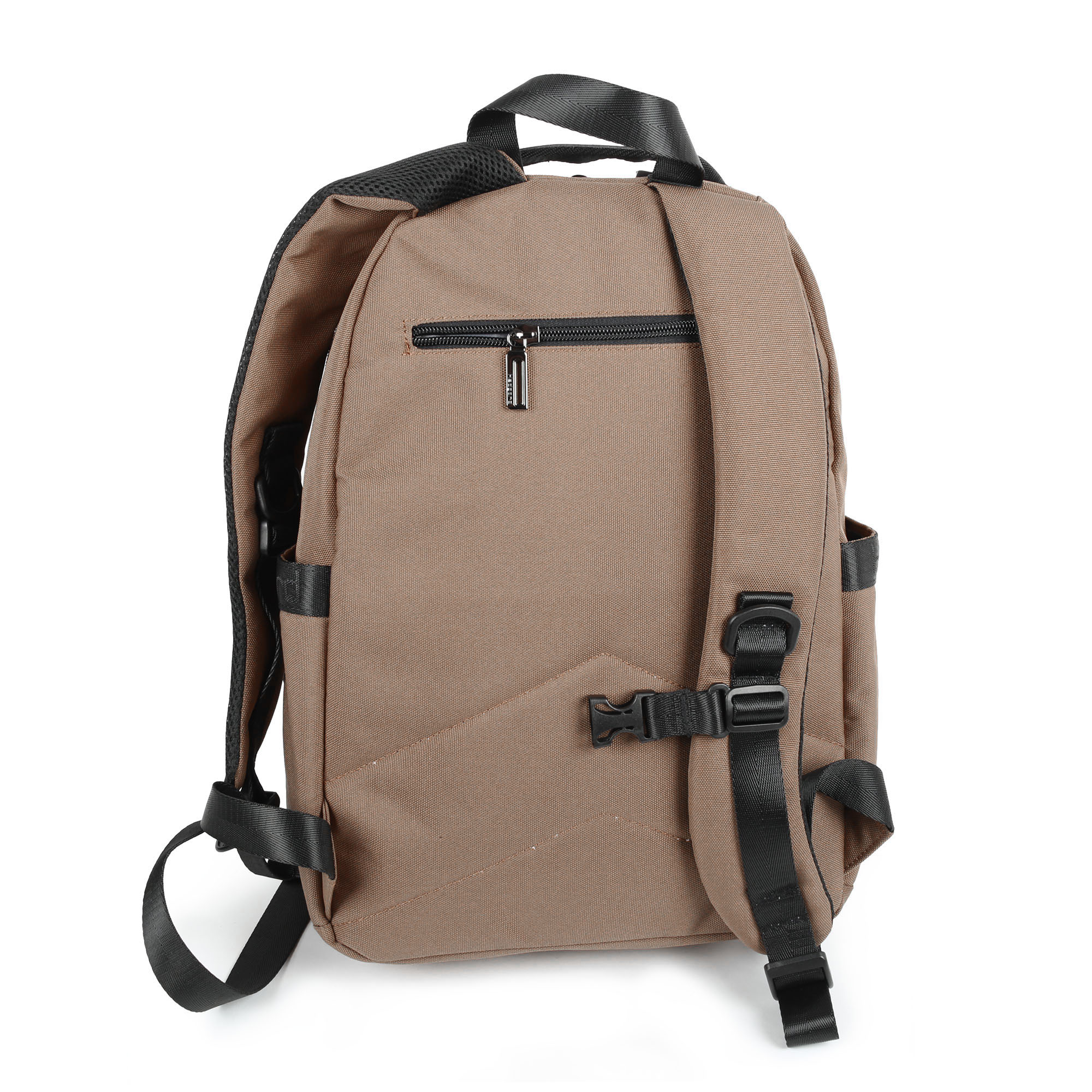 Небольшой городской рюкзак объемом около 16 литров. Размеры: 29 x 39 x 16 см. Основное отделение закрывается на молнию. Внутри — потайной карман на молнии и один открытый. Вспомогательное отделение без внутренних карманов. Снаружи — три вшивных кармана на молнии, включая один потайной на спине, и один накладной карман на молнии. По бокам — два открытых кармана для бутылок с водой. Ткань плотная, зернистая. Внутри отделений — подкладка из нейлона, стенки, спинка и дно мягкие, из эластичной пены, которая защищает от ударов.