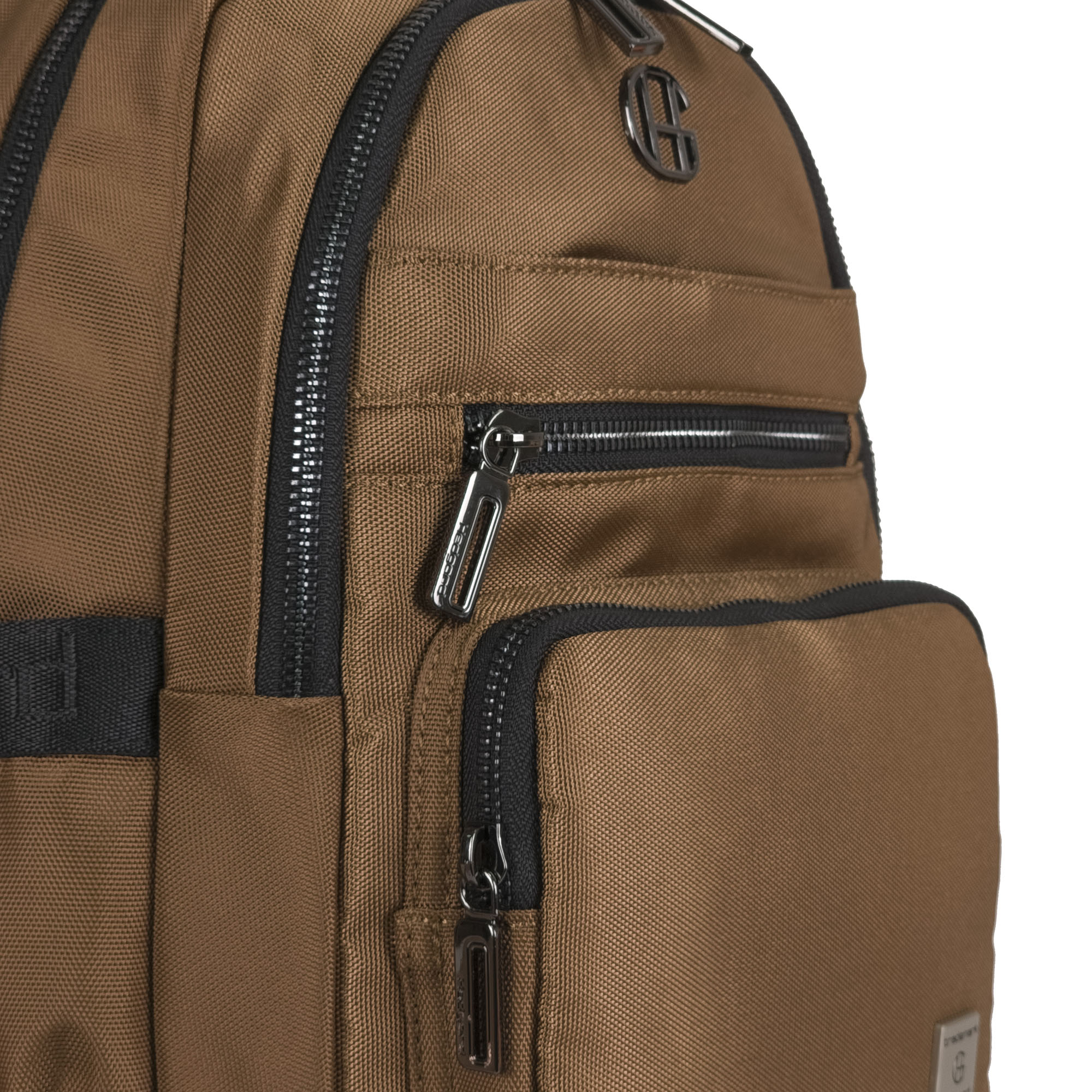 Снаружи - три вшивных кармана на молнии, в т.ч. один потайной на спинке рюкзака, и один накладной карман на молнии.