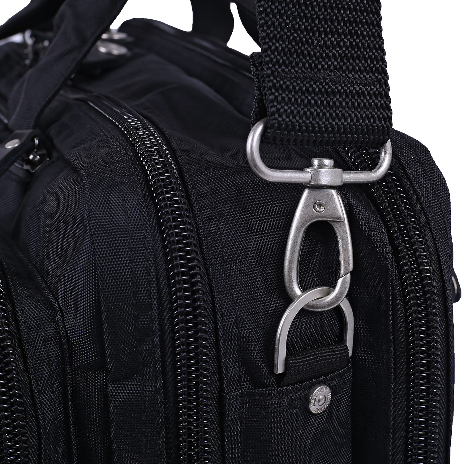 В сумке огромное количество карманов и отделений. Фактура - плотная, под тканью есть основа из пены. Сумку можно носить как рюкзак, для этого достаточно расстегнуть молнию на обратной стороне и достать лямки.