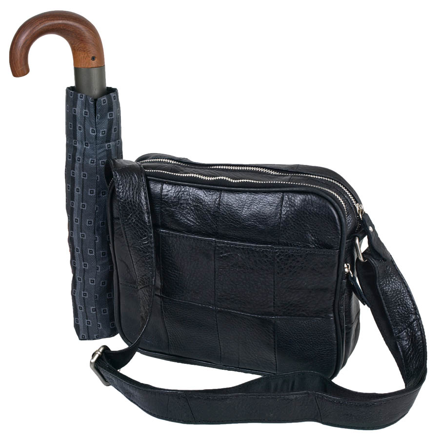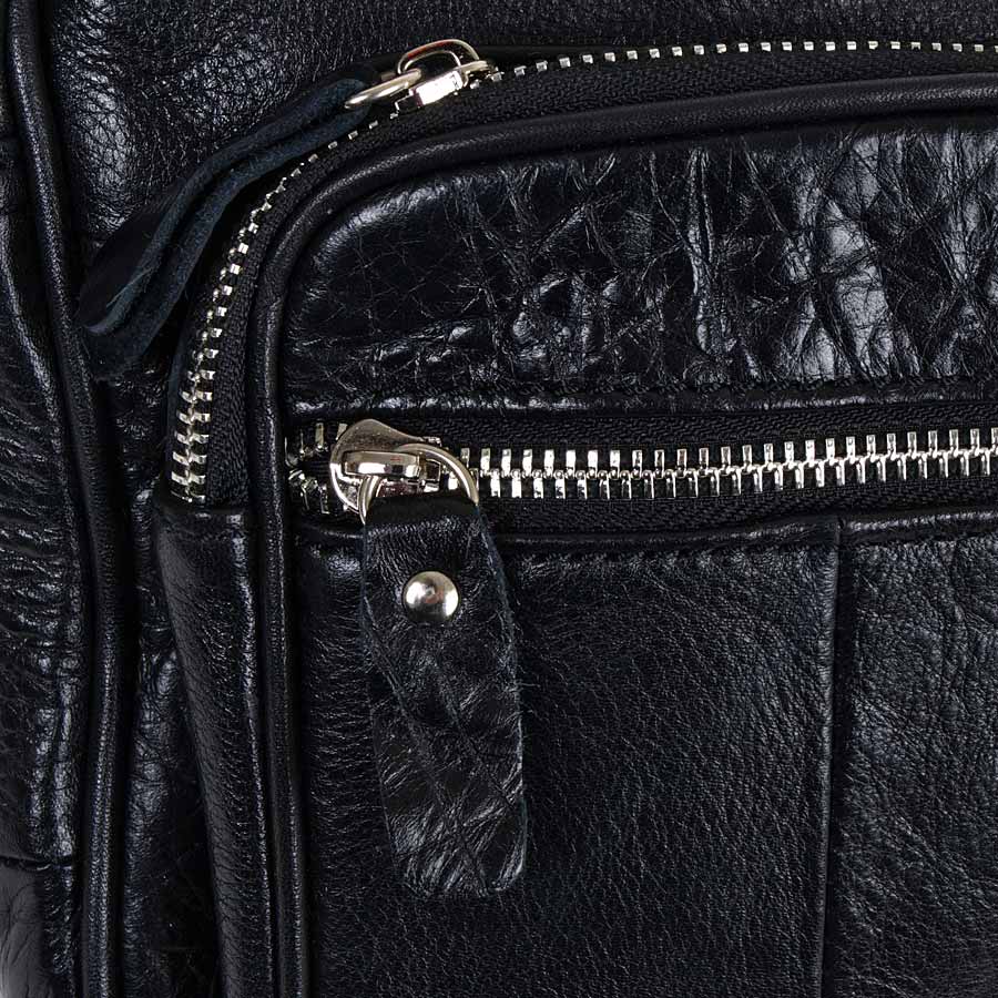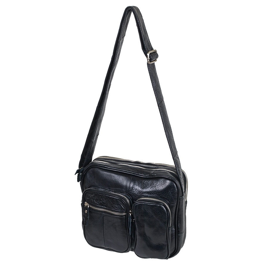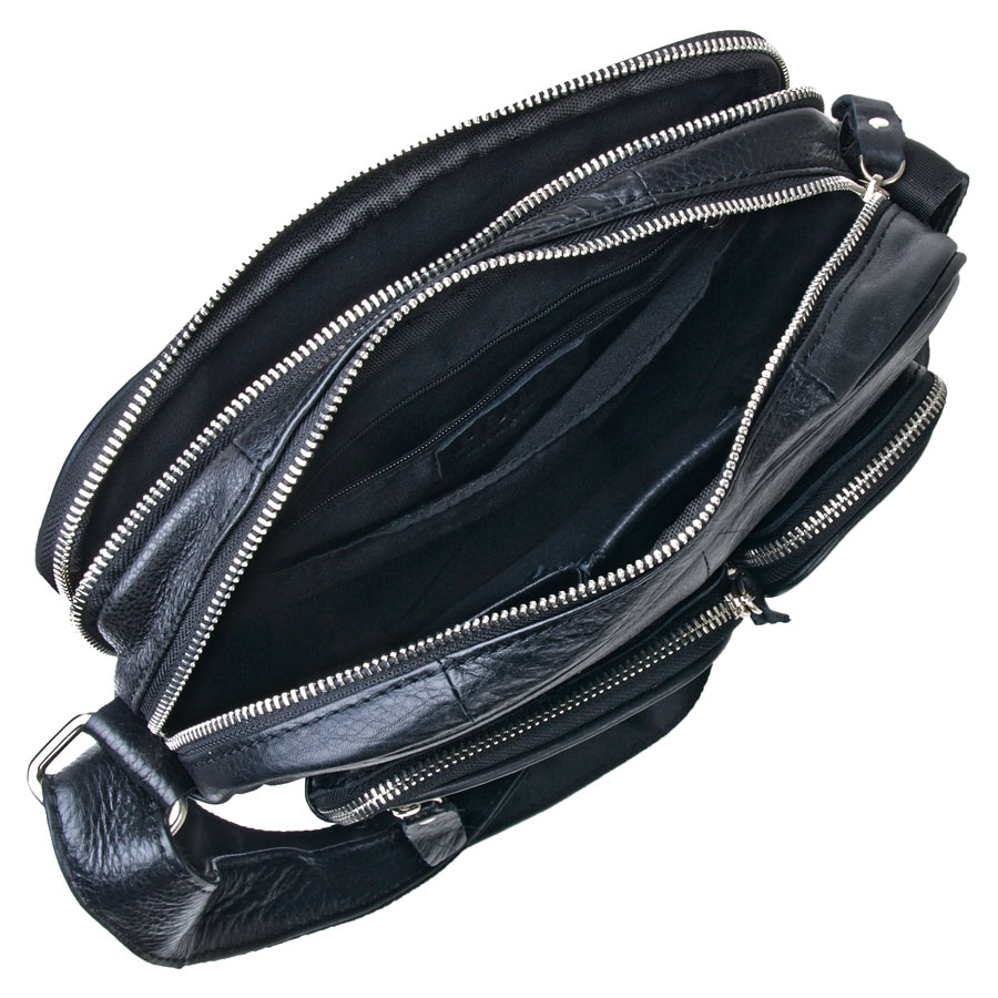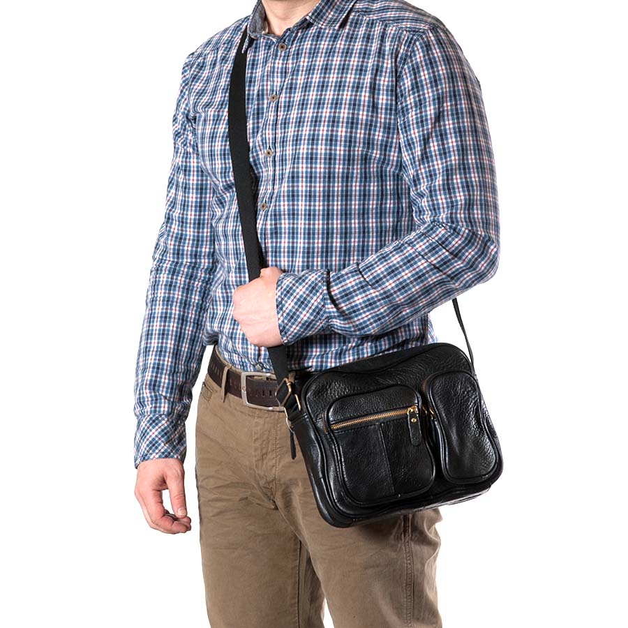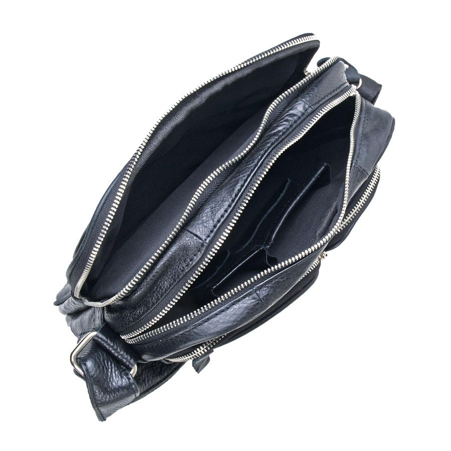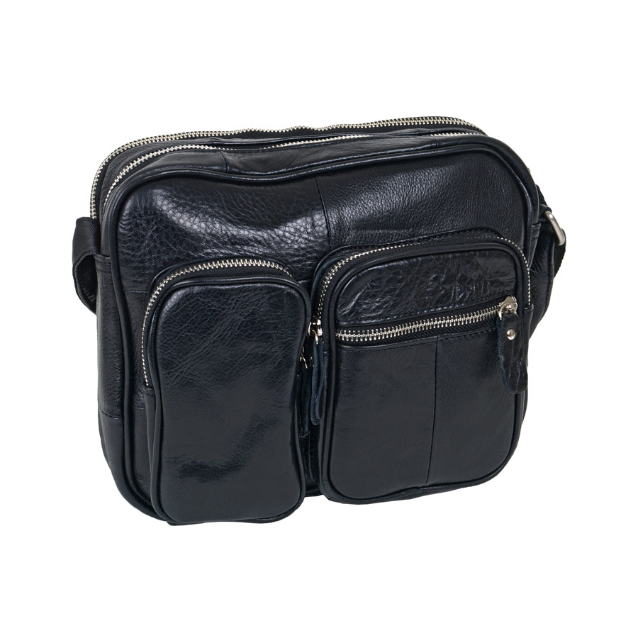 Мужская сумка из натуральной кожи (автовизитка). Два основных отделения. Внутри — один карман на молнии и три открытых кармана для небольших предметов. Снаружи — три кармана на молнии и один карман на магнитной кнопке. Плечевой ремень несъемный.