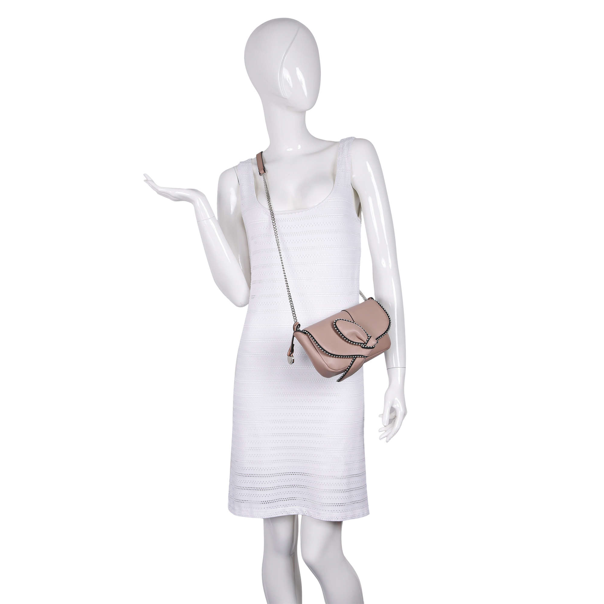Изысканная сумочка-клатч на ремне-цепочке - это стильный аксессуар для создания непревзойдённого вечернего образа. Модель закрывается клапаном на магнитной кнопке и на пластиковую молнию, клапан декорирован бантом и металлическими шариками, напоминающими мелкие жемчужины. Длина ремня-цепочки составляет 106 см.