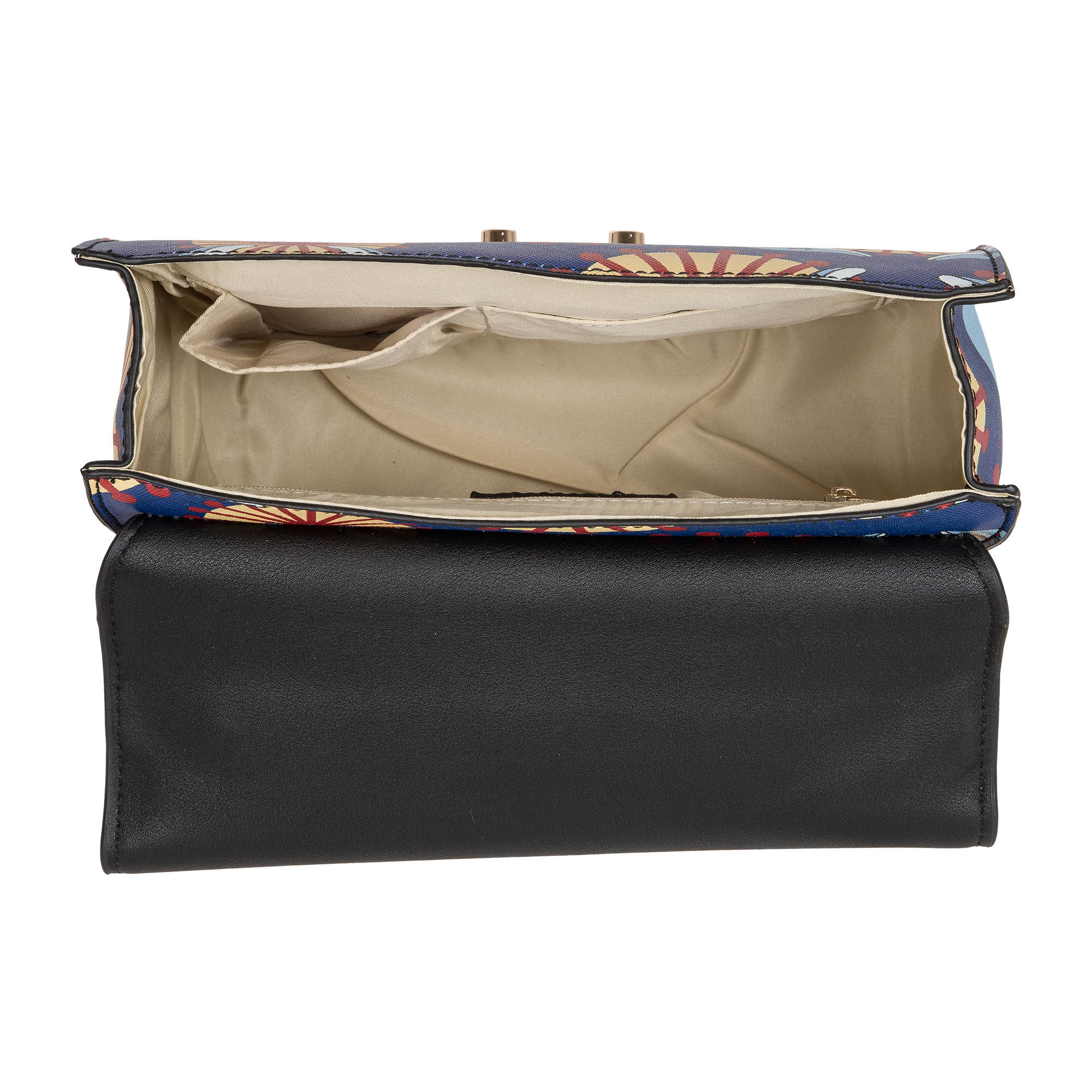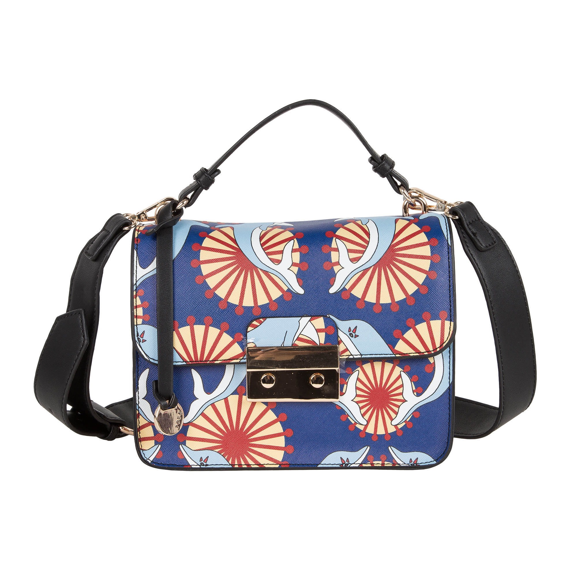 Миниатюрная женская сумка Pola выполнена из экокожи и украшена разноцветным оригинальным рисунком, изображающим птиц и животных. Основное отделение закрывается клапаном с помощью металлического замка-защёлки, который в свою очередь выступает в качестве полноценного декоративного элемента. Данную модель можно носить как в руках, так и на плече с помощью съёмного, регулируемого ремня. Цвет фурнитуры - золото.