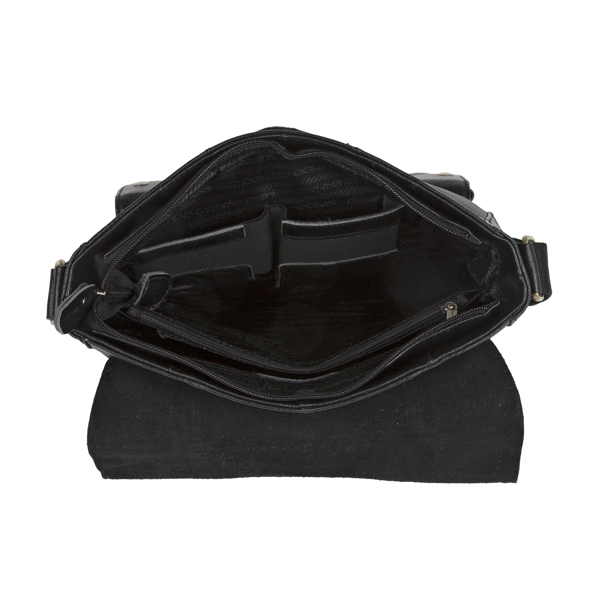 Сумка имеет гладкую фактуру и элегантный черный цвет, который легко сочетается с любым образом. Внутри основного отделения находится один карман на молнии и два открытых кармана, что позволяет удобно разместить все необходимые вещи. Снаружи расположены один карман на магнитной кнопке и два кармана на молнии, что обеспечивает быстрый доступ к содержимому.