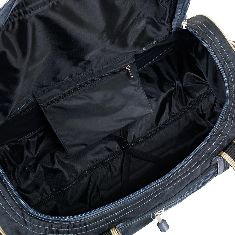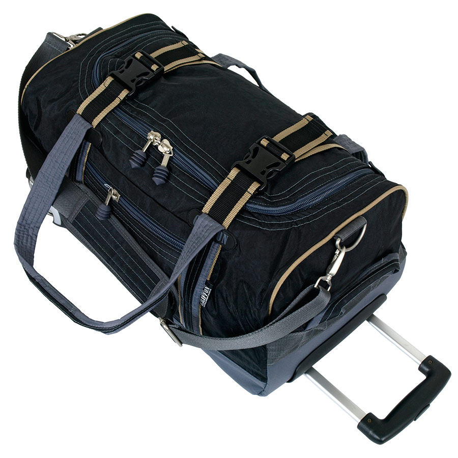 Сумка дорожная на колесах, малая. Основное отделение с п-образным входом. Внутри есть стягивающие ремни и два кармана на молнии. Снаружи — один карман на молнии. Сумку можно везти как за выдвигающуюся ручку, так и за ручку, пришитую к торцу сумки. Дно в области колес обшито резиной. По бокам есть стягивающие ремни для фиксации объема. Сумку можно поставить в вертикальное положение.