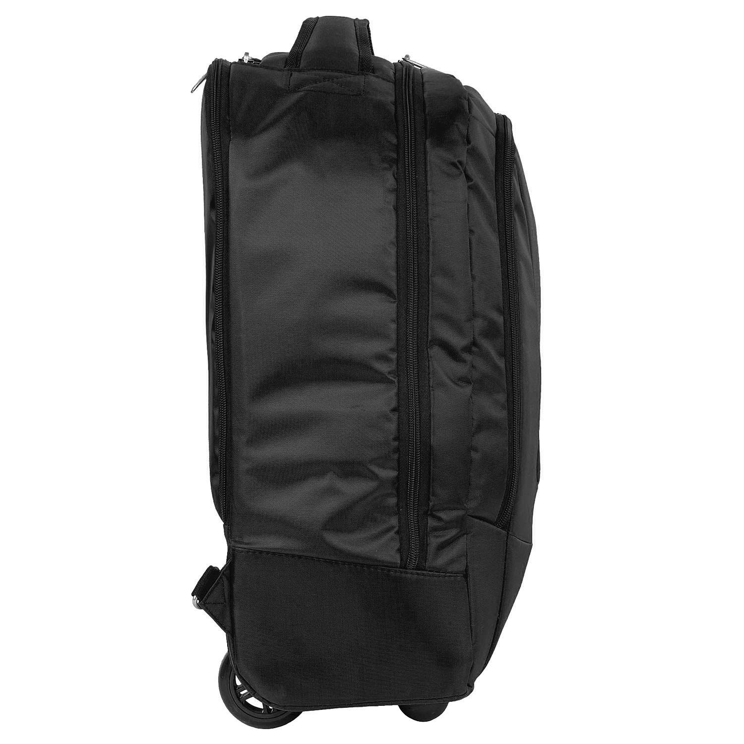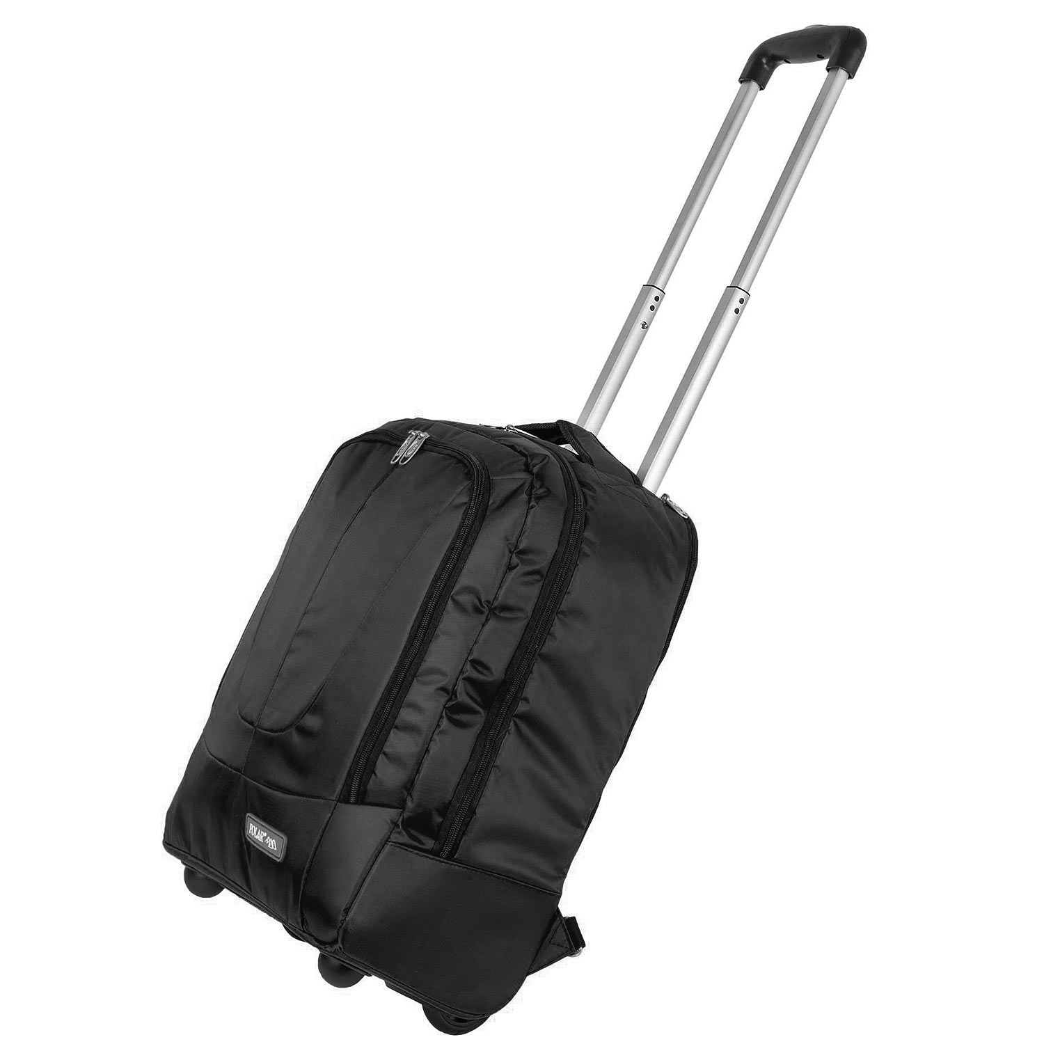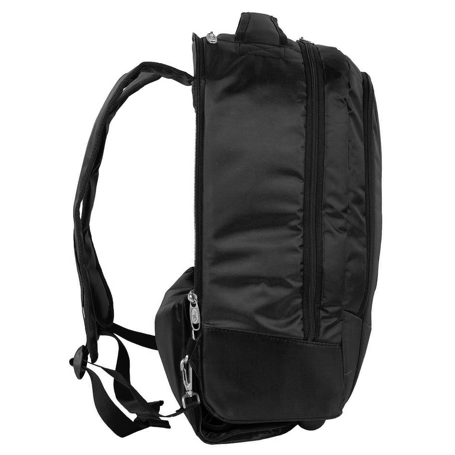Рюкзак на колесах — недорогая, функциональная, легкая и компактная модель багажа, которую можно взять с собой как ручную кладь на борт самолета. В заднюю стенку встроены рюкзачные лямки, которые можно достать расстегнув молнию. Внутри — одно большое отделение с фиксирующими ремнями и с карманом для ноутбука 15″. Снаружи есть большой карман на молнии. Выдвигающаяся ручка полностью убирается внутрь чемодана и закрывается на молнию.