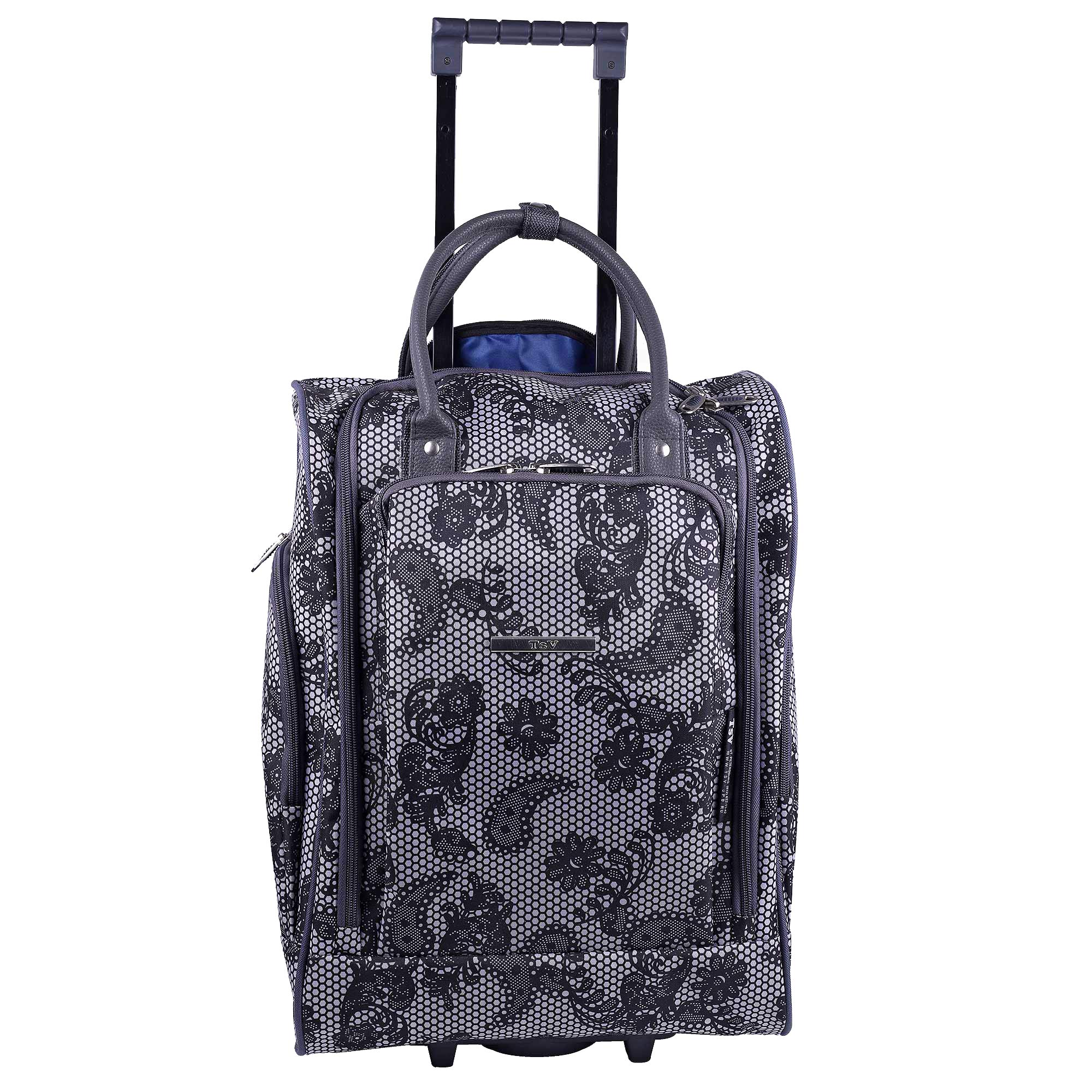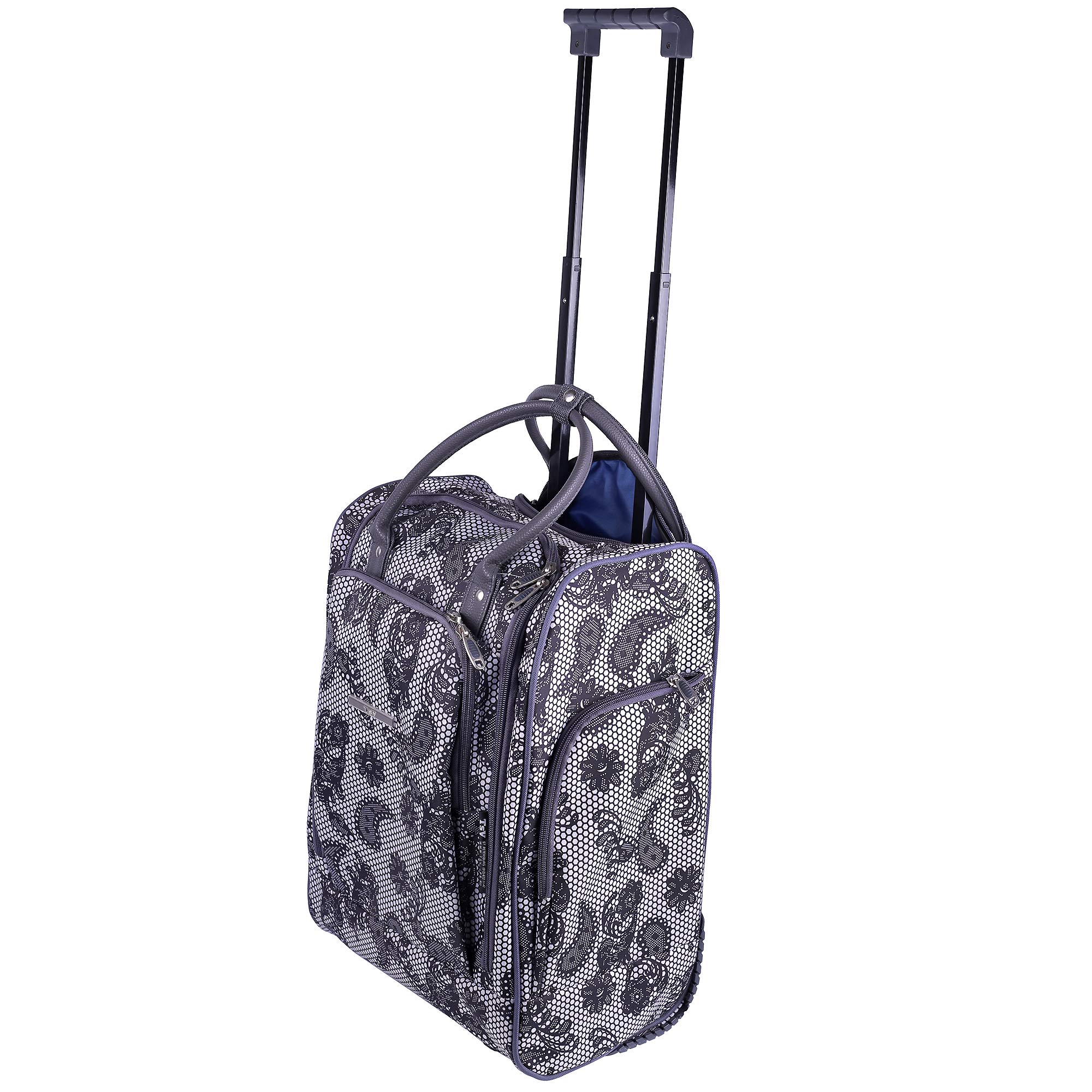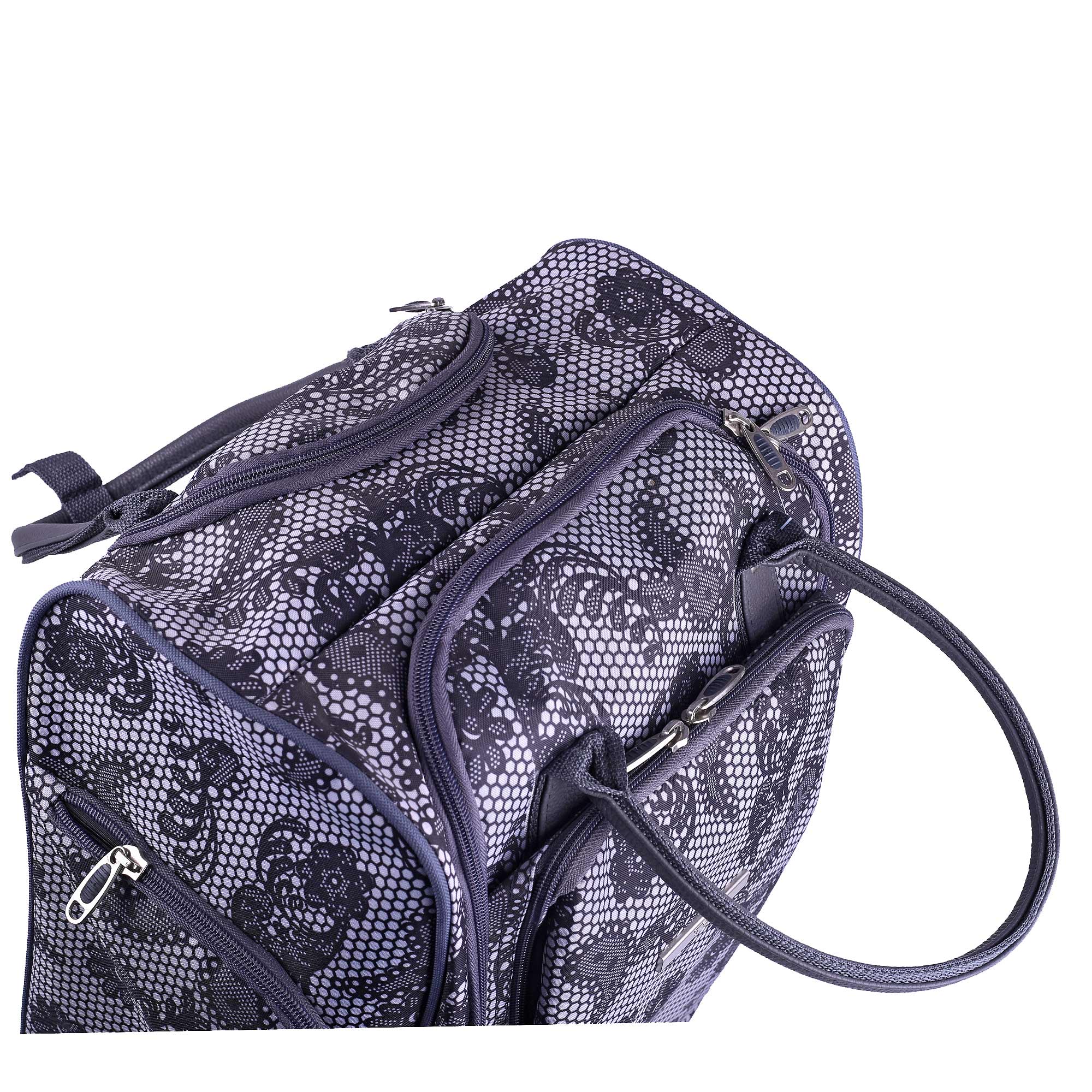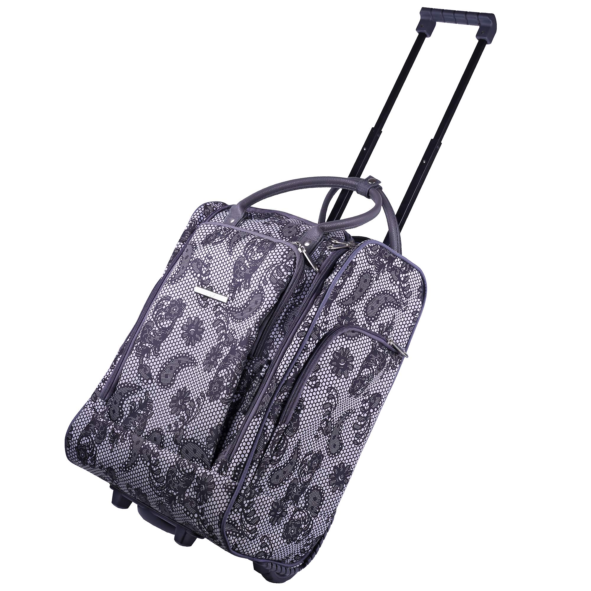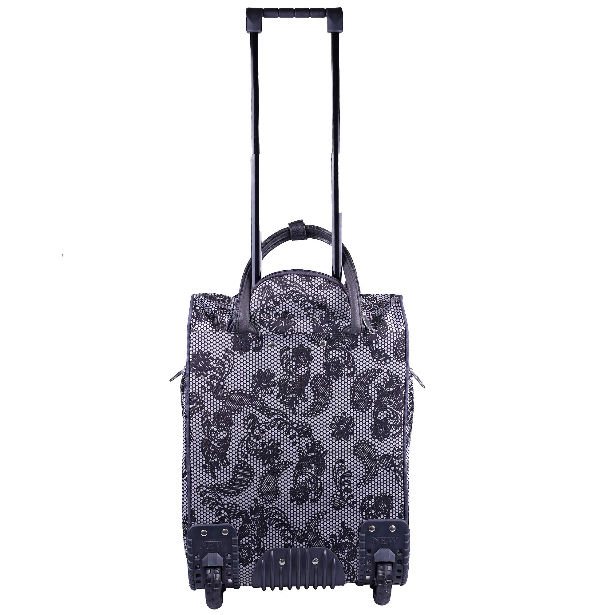 Женская сумка на колесах с выдвижной ручкой. Основное отделение обшито подкладкой и имеет П-образный вход, что очень удобно при укладке вещей. Внутри - один карман на молнии. Снаружи - три кармана на молнии. Данная модель можно использовать не только в поездках или путешествиях, но и как хозяйственную, повседневную сумку.