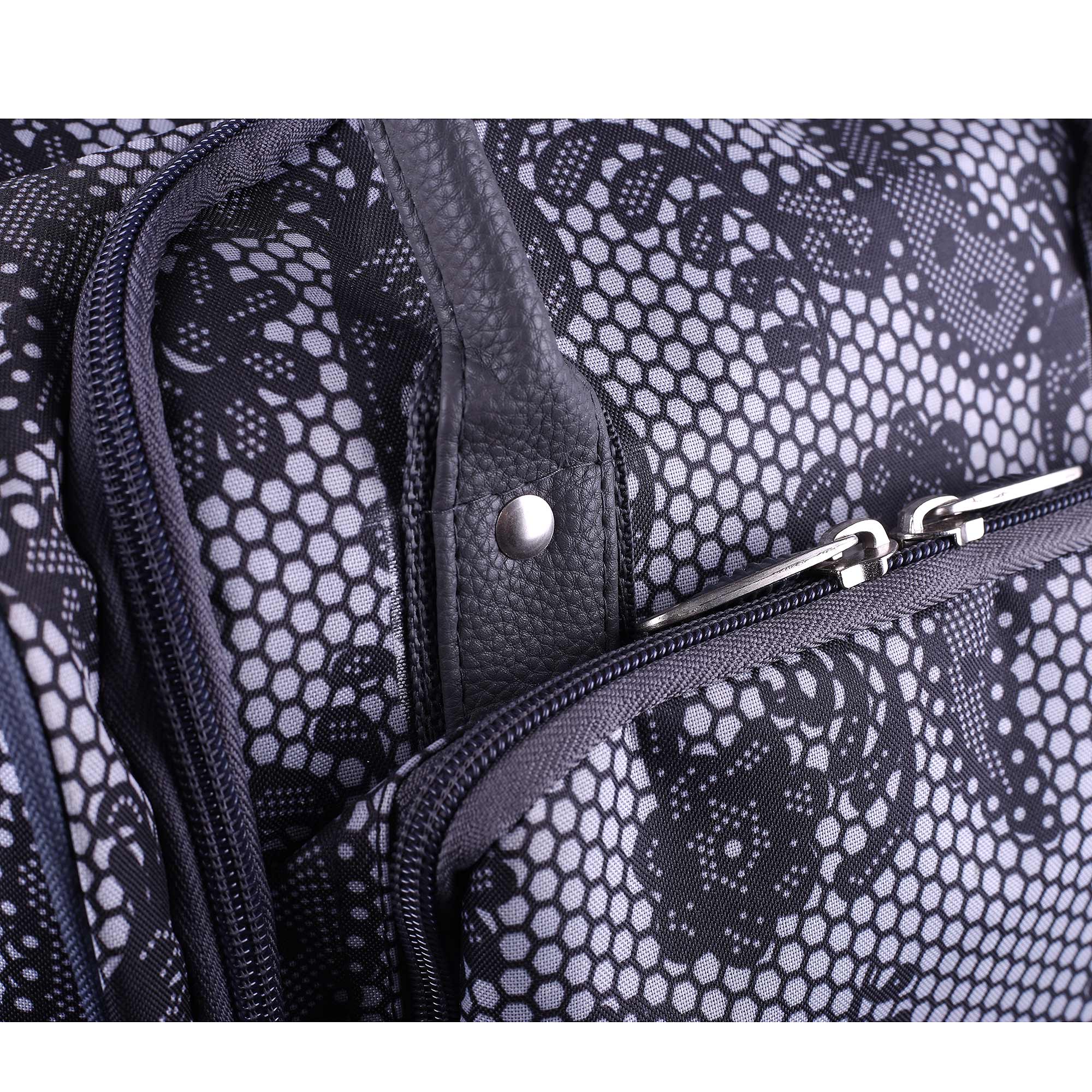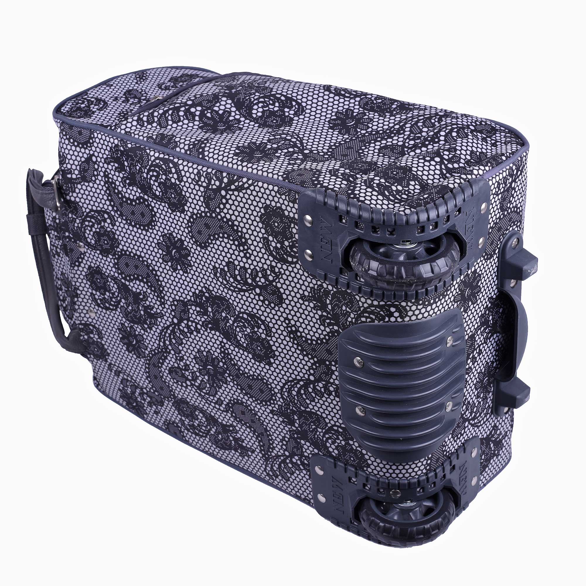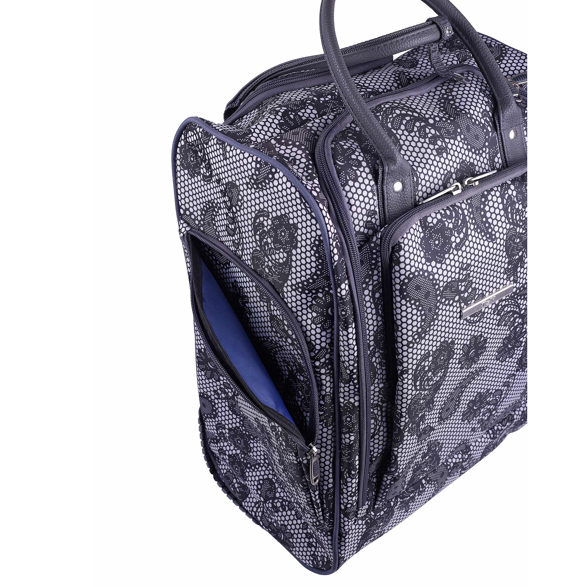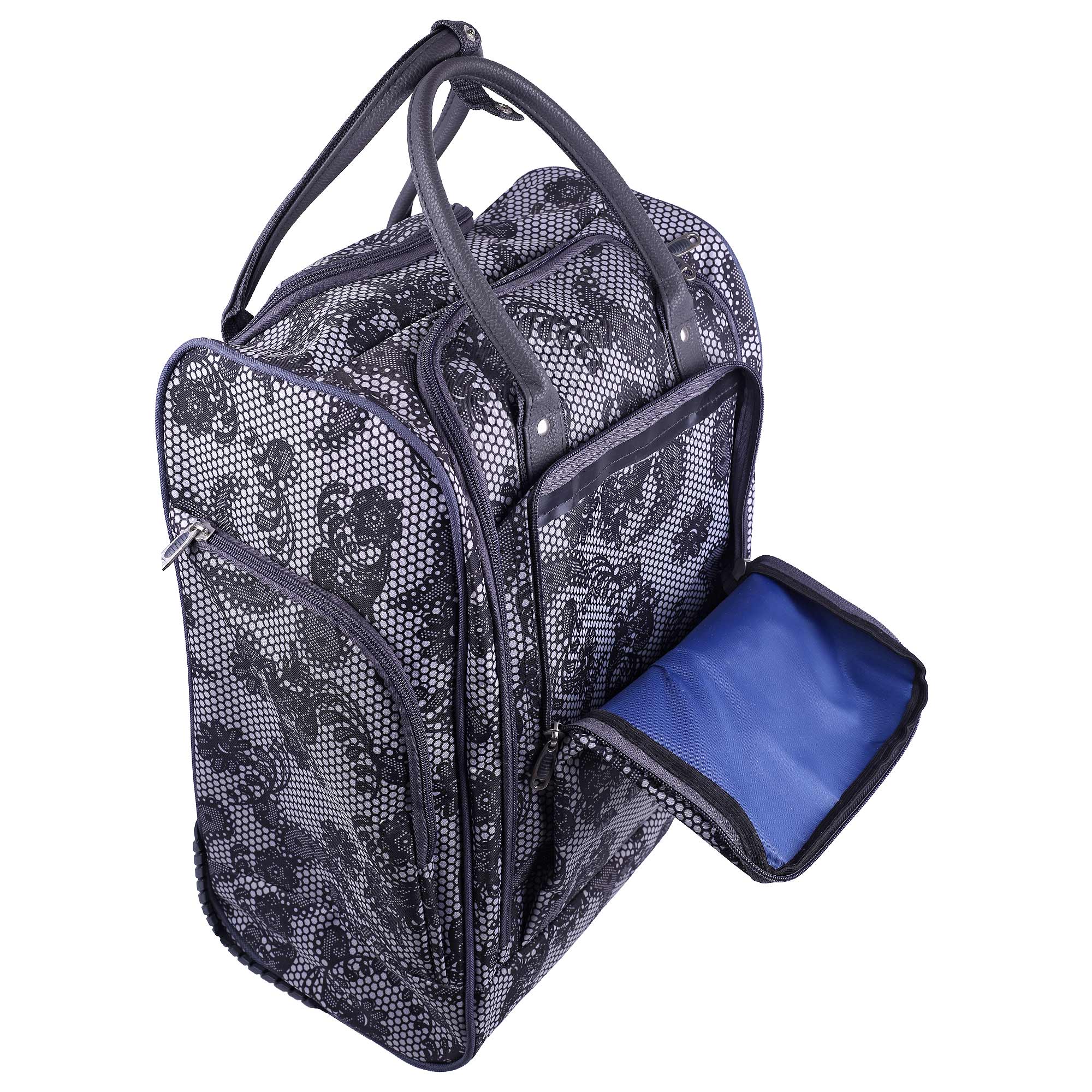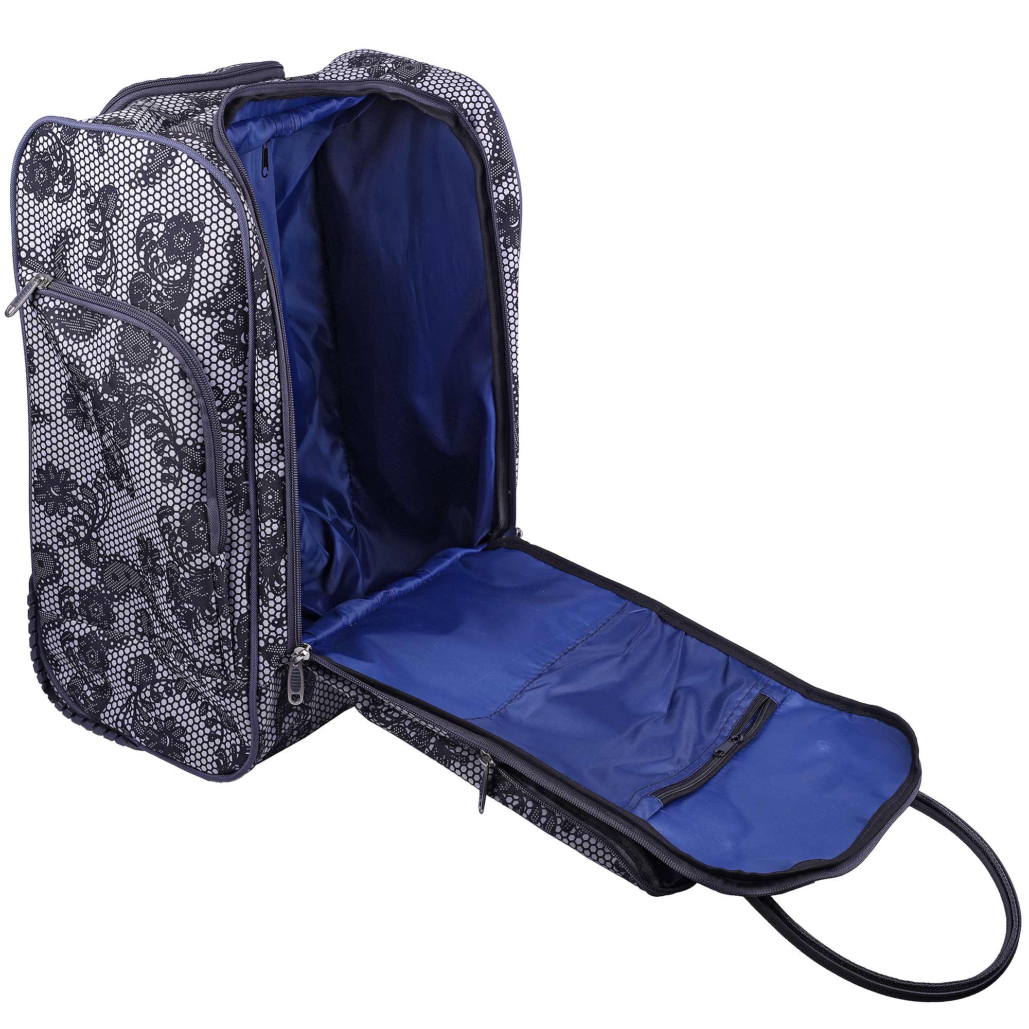 Женская сумка на колесах с выдвижной ручкой. Основное отделение обшито подкладкой и имеет П-образный вход, что очень удобно при укладке вещей. Внутри - один карман на молнии. Снаружи - три кармана на молнии. Данная модель можно использовать не только в поездках или путешествиях, но и как хозяйственную, повседневную сумку.