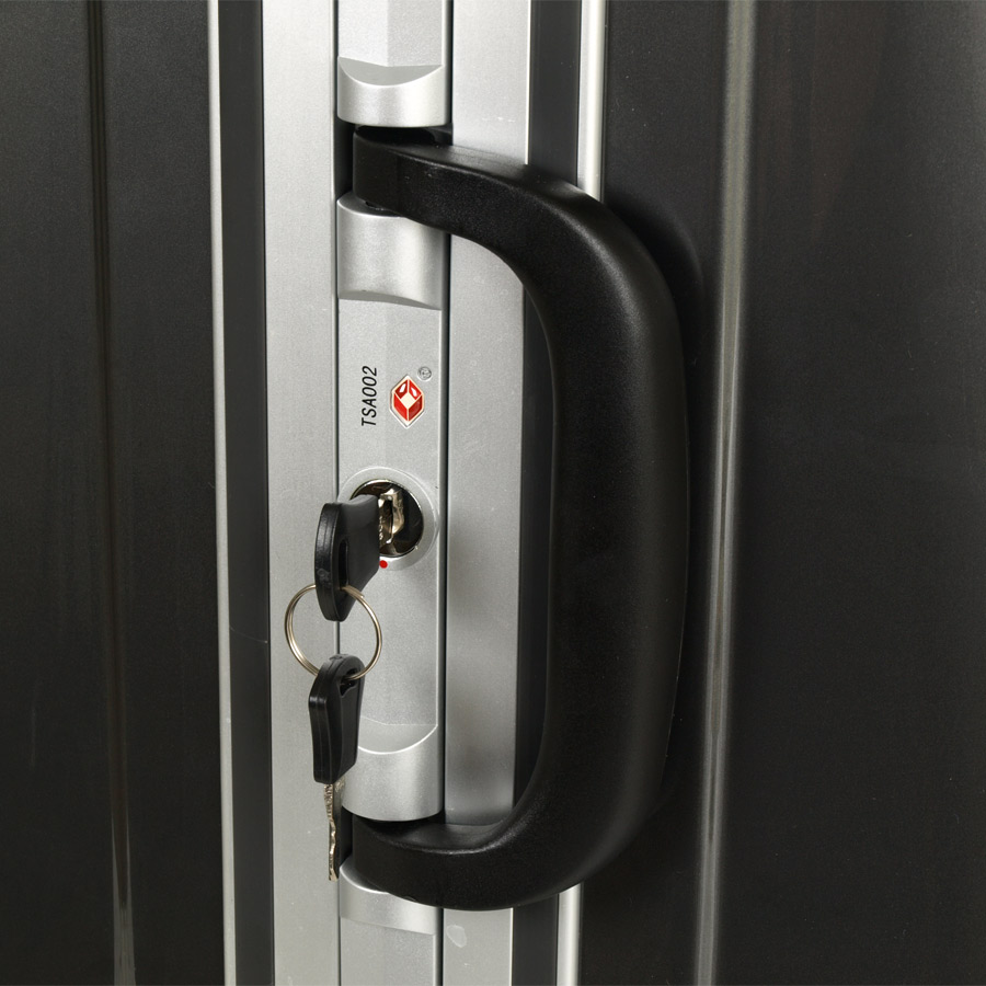 Чемодан на колесах с выдвигающейся ручкой ,большой. Ударопрочный ABS пластик. Основное отделение обшито мягкой подкладкой. Внутри — два кармана из сетки и стягивающие ремни. Полезный объем основного отделения 46×69×34см. Ручка фиксируется на высоте 92 и 104см. Особенностью данной модели является отсутствие молнии, что очень сильно затрудняет проникновение внутрь третьих лиц. Чемодан закрывается как кейс и имеет TSA замок с ключом.