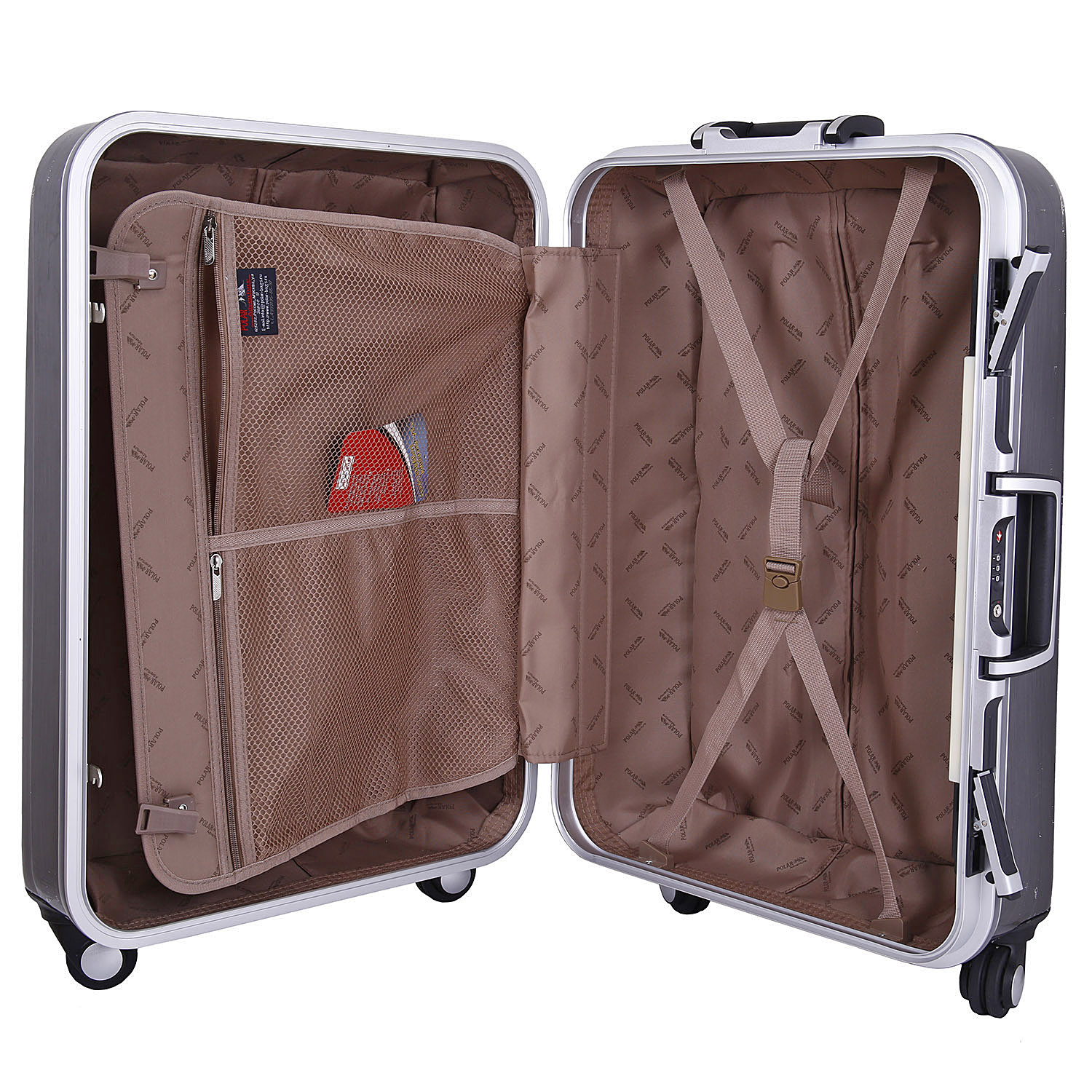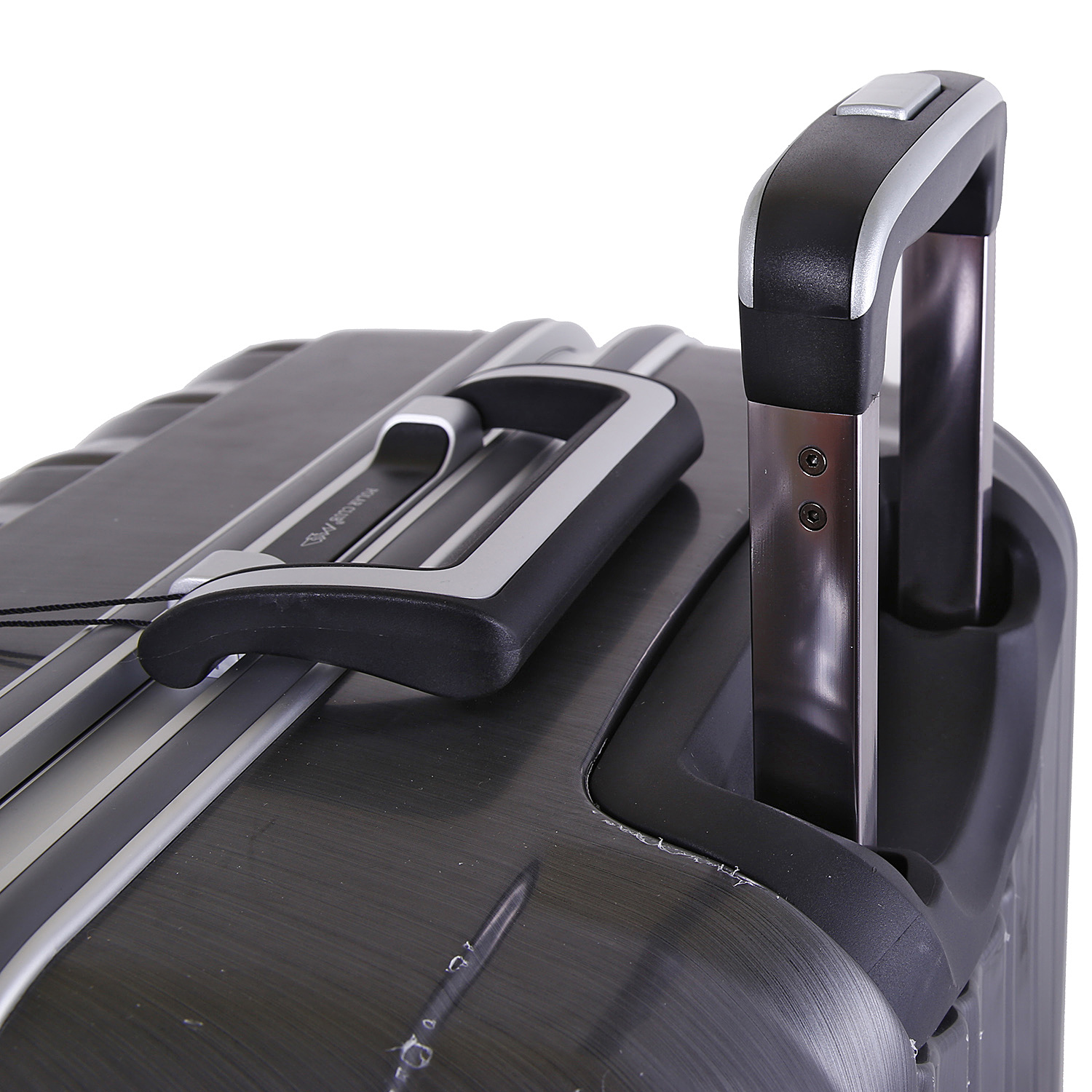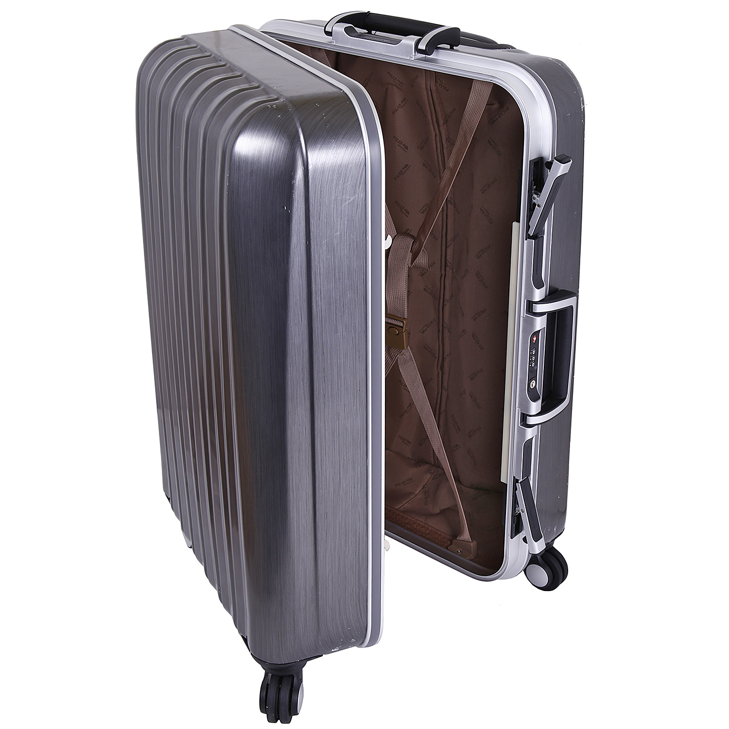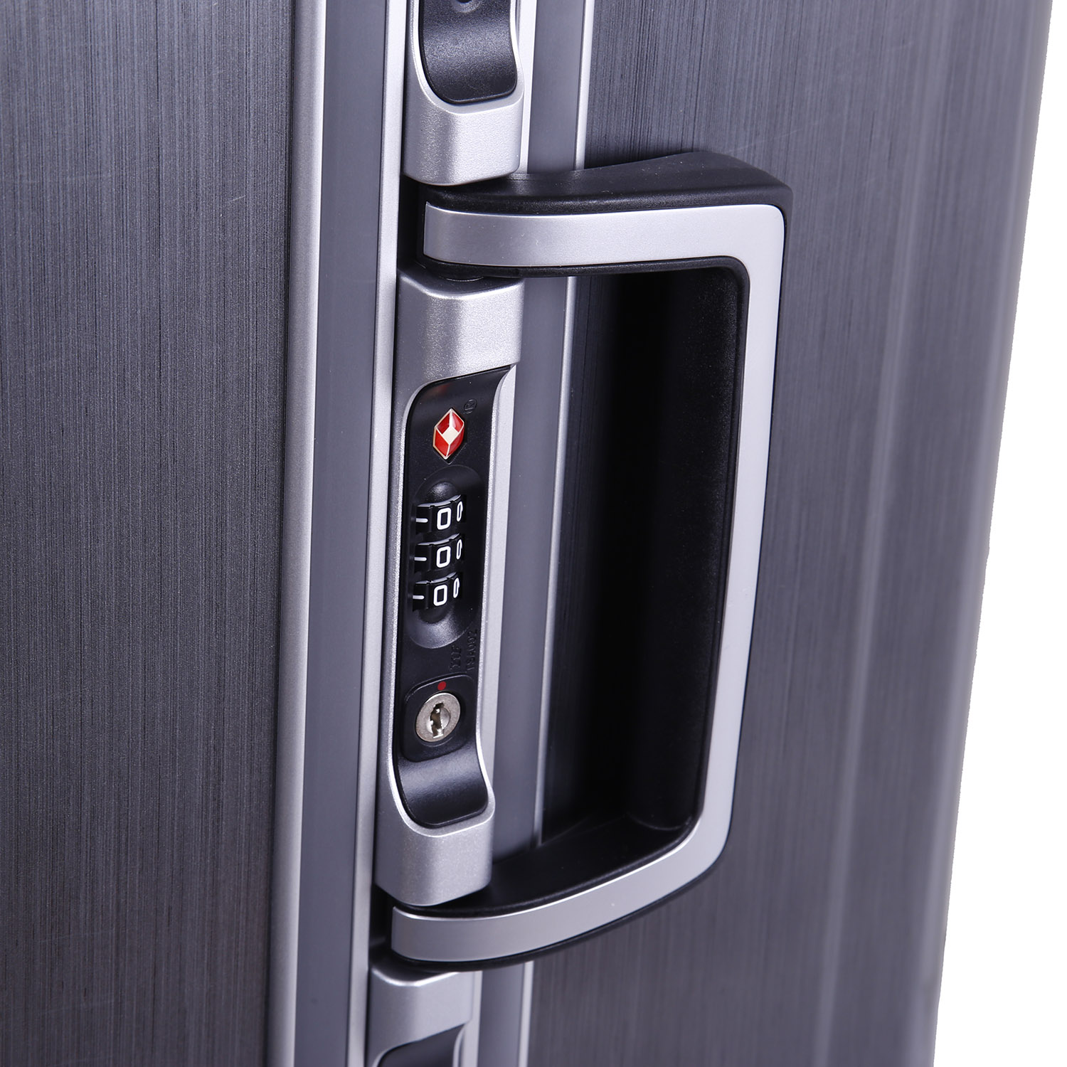 Чемодан премиум класса с защелками и TSA замком. Основное отделение закрывается кодовым замком. Внутри — два кармана из сетки и стягивающие ремни. Полезный объем основного отделения 42×59×28см. Выдвижная ручка фиксируется на высоте 104см. В этой модели чемодана, вместо молнии — алюминиевый профиль, с двумя механическими замками, что очень сильно затрудняет несанкционированное вскрытие. В комплекте есть транспортировочный чехол.